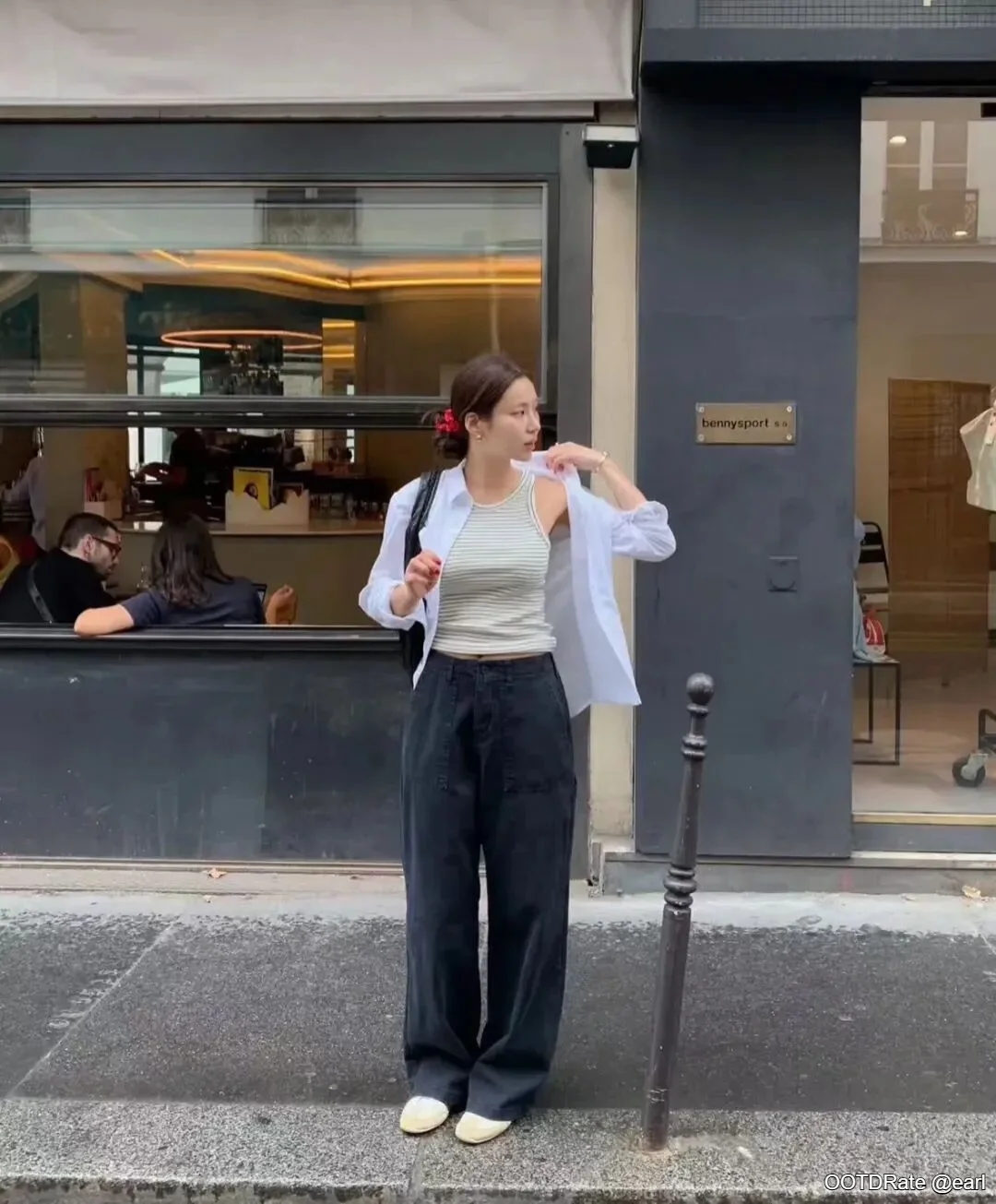 The outfit here scores a 7.8 out of 10. This look features a relaxed yet polished style achieved through a combination of a striped tank top, a white button-up shirt, and wide-leg black trousers. The tank top provides a casual yet sophisticated base, presenting a nice contrast with the crisp white shirt worn unbuttoned, which adds an effortless layer to the ensemble. The choice of wide-leg trousers introduces an element of modern chic, balancing the casual top with a more refined bottom.