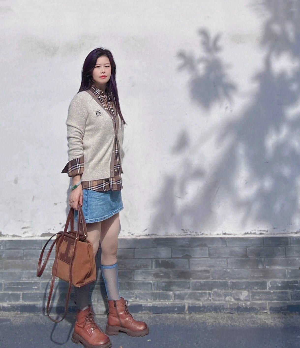 The chunky brown boots are both practical and stylish, adding a rugged touch that contrasts nicely with the softer upper layers. The brown leather bag is a versatile accessory that ties in with the boots, completing the outfit with cohesion.