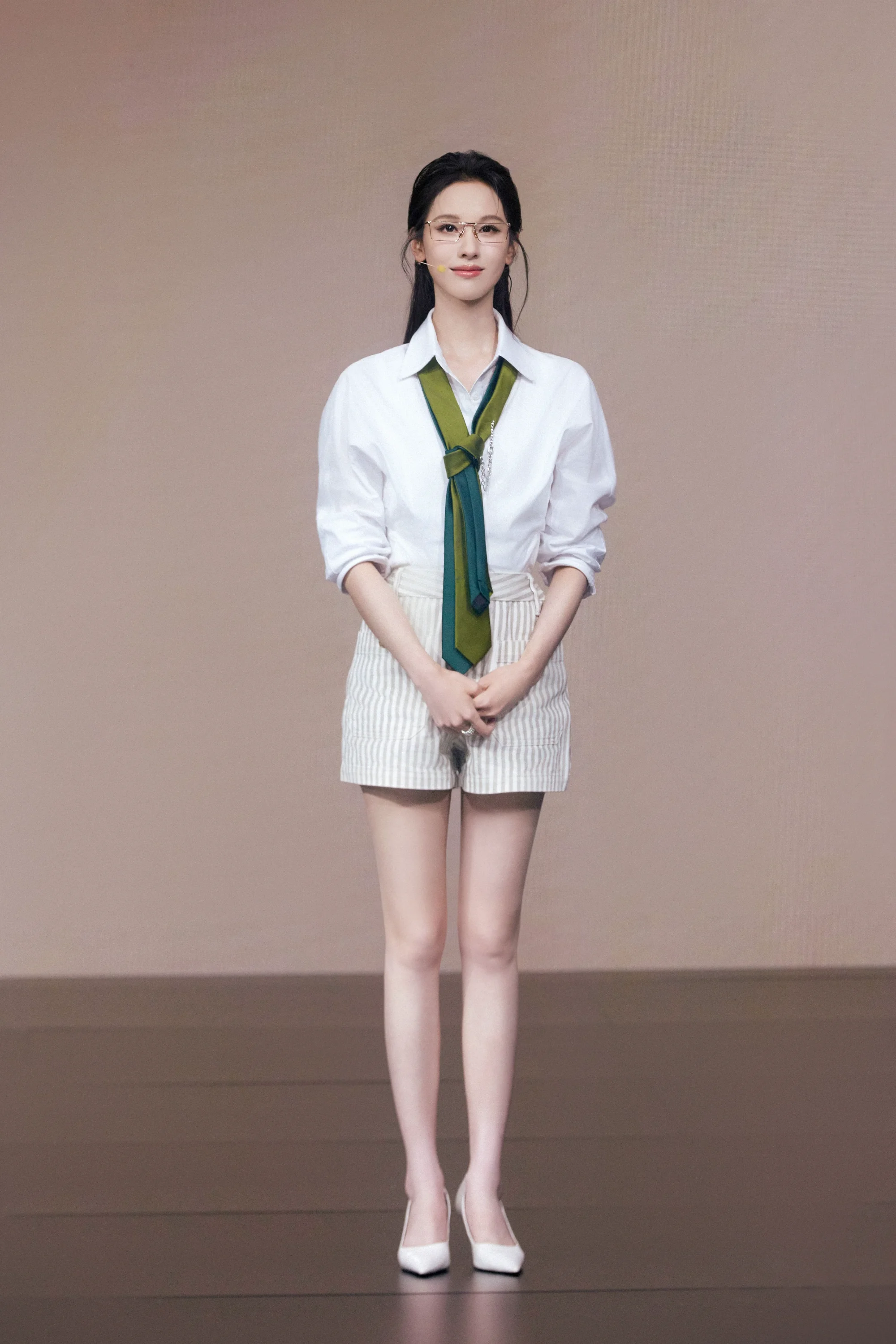The shorts introduce a subtle pattern and texture, harmonizing well with the overall tone while maintaining a sense of lightness perfect for transitional weather. Their tailored fit enhances the silhouette, ensuring the outfit remains streamlined and stylish.