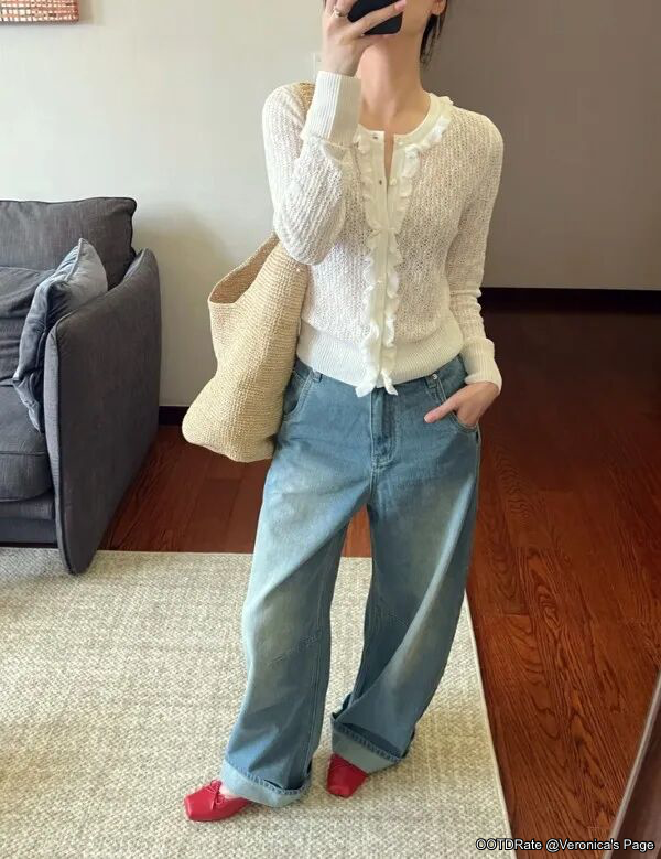 Casual Chic: White Knit Cardigan and Wide-Leg Jeans with a Pop of Red