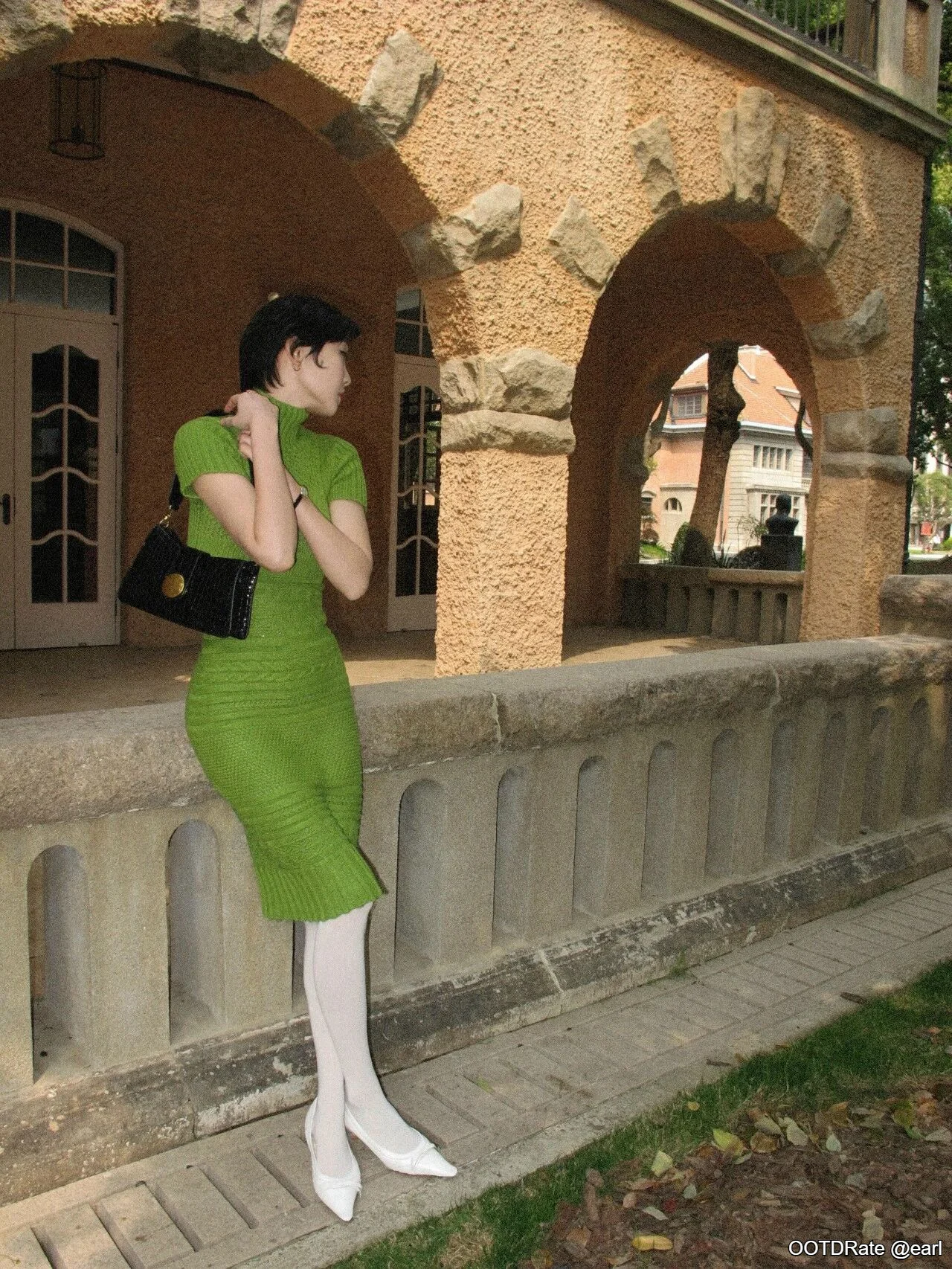 This outfit scores an 8.2 out of 10. The vibrant green dress stands out as a bold and confident choice. Its form-fitting silhouette emphasizes the figure, creating an elegant and streamlined look. The choice of white tights adds a unique contrast, bringing a touch of retro charm while keeping the outfit cohesive. The pointed white heels complement the tights and add sophistication, elongating the legs effectively.