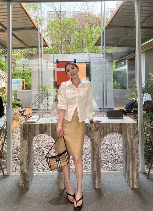 Elegant White Blouse with a Beige Pencil Skirt and Plaid Handbag