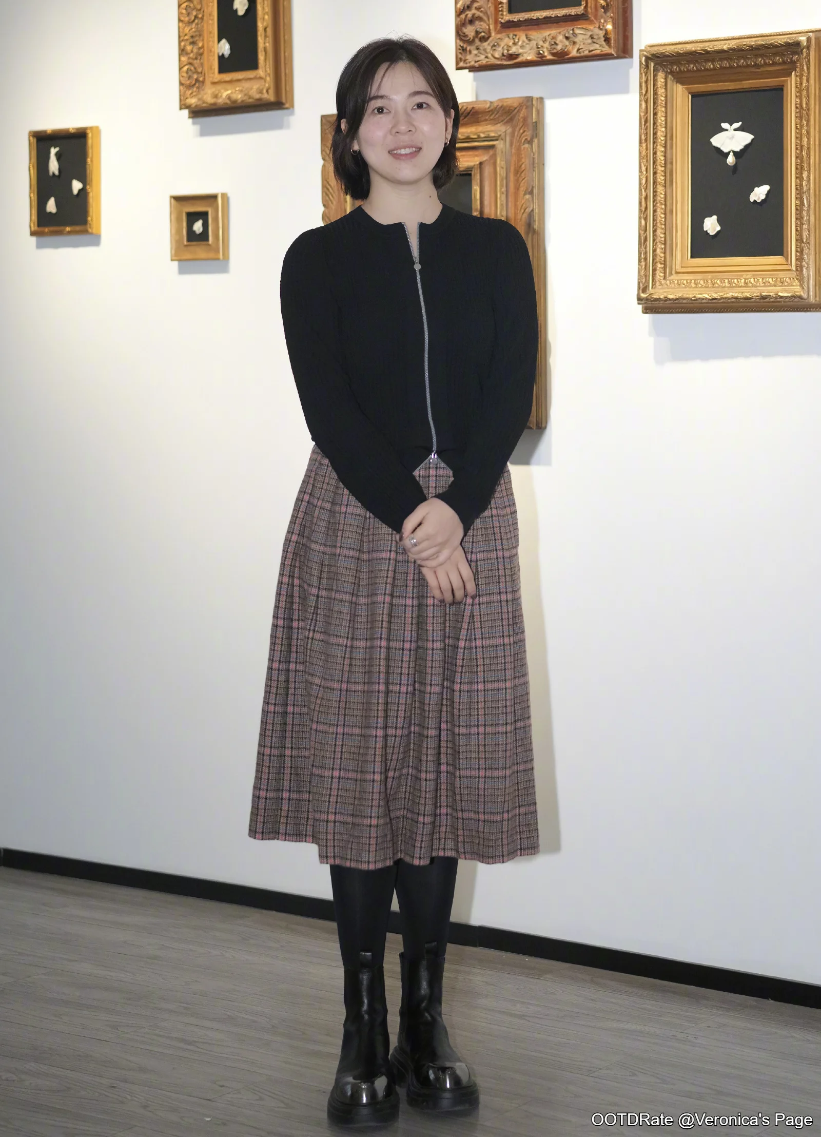 This outfit combines a classic, minimalistic style with a touch of modernity. The black zip-up top offers a sleek, contemporary look while maintaining an understated elegance. Its fit is streamlined, providing a neat silhouette that complements the pleated plaid skirt. The skirt adds a timeless charm with its muted tones and check pattern, which is versatile for various occasions, such as gallery visits or casual gatherings.