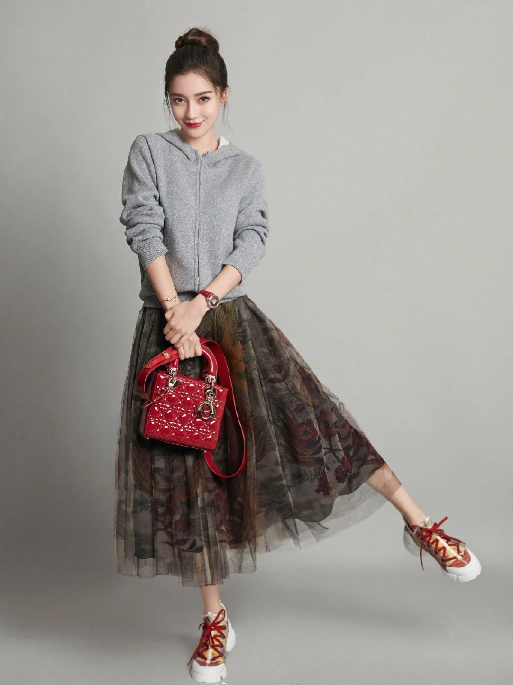 Stylish Balance of Grey Hoodie and Patterned Tulle Skirt with Red Accents