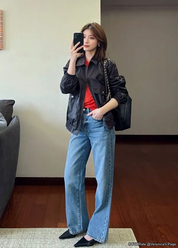 Casual Chic: Red Top with Black Jacket and Light Blue Jeans