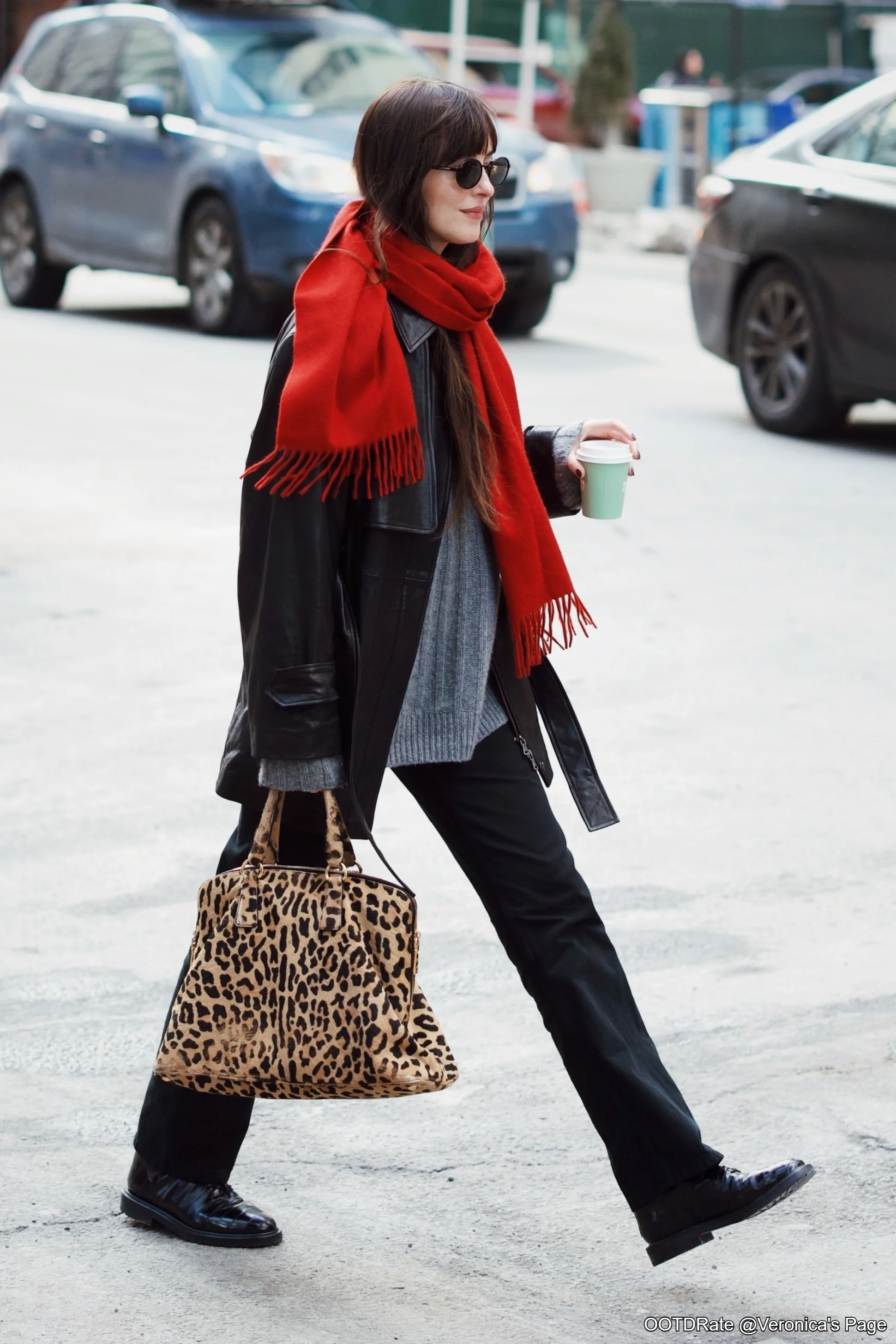 Dakota Johnson's Chic Street Style with Leather Jacket, Red Scarf, and Leopard Print Bag