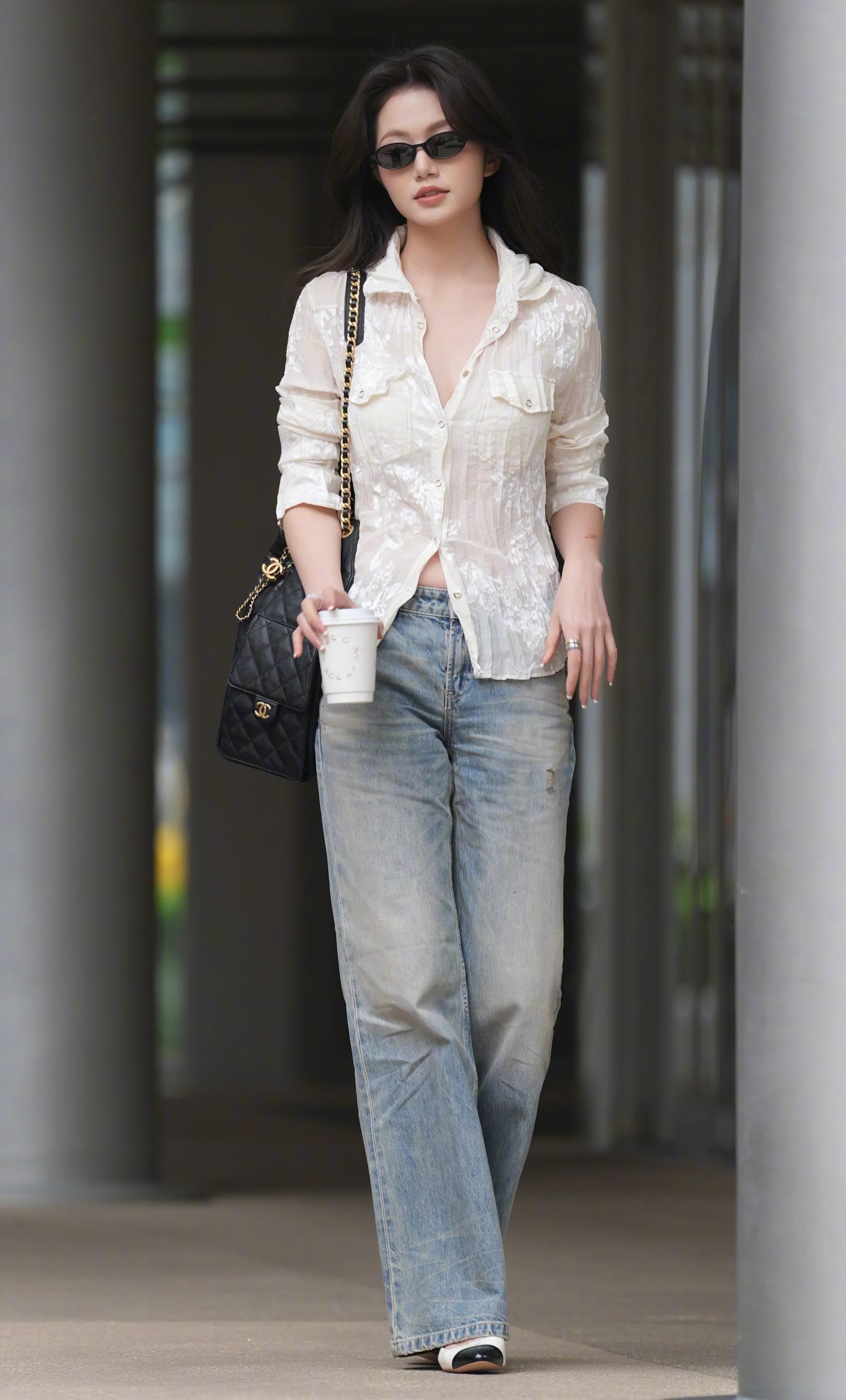 The overall silhouette is loose yet structured, maintaining a harmony that flatters without overwhelming. Pairing this ensemble with understated accessories, such as black sunglasses and a classic black handbag, contributes to the outfit’s effortlessly chic aesthetic. The pop of black from the accessories adds needed contrast and definition, making the outfit more visually engaging.