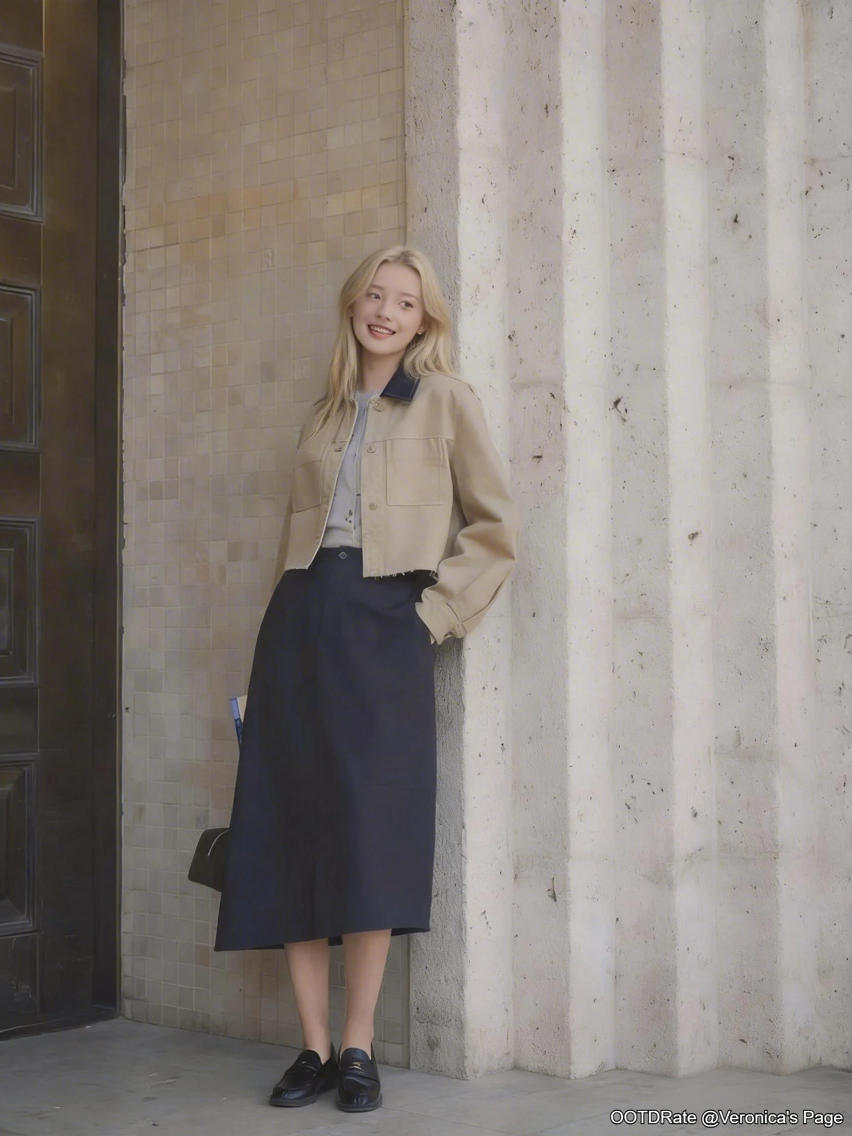 This outfit scores an 8.4 out of 10. The combination of the neutral-toned, cropped jacket with a contrasting dark collar paired with a simple gray top creates a balanced and sophisticated look. The jacket adds structure and sharpness, complementing the softness of the top. The dark midi skirt offers an elegant, streamlined silhouette, which is both versatile and flattering. It adds a touch of formality that can transition well from casual to more polished environments.