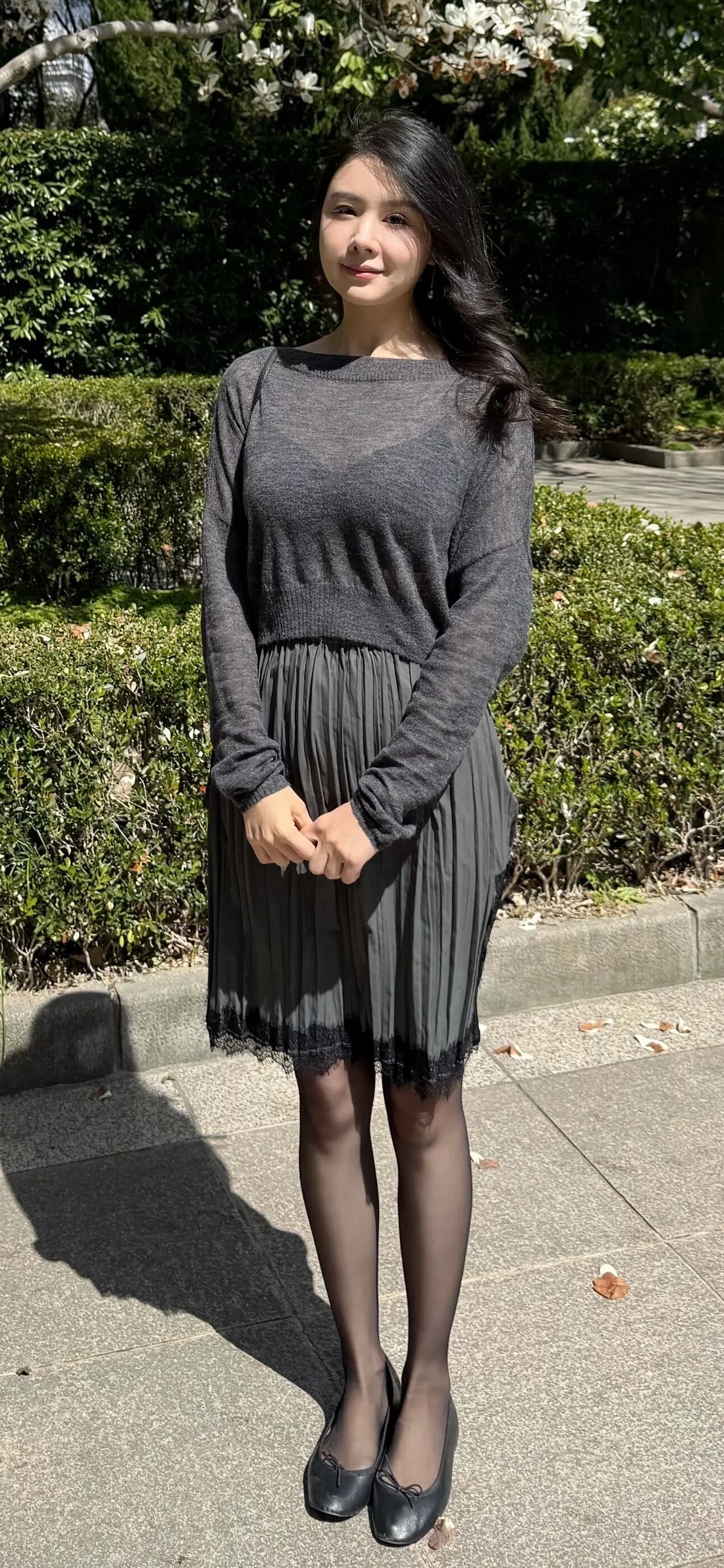 This outfit scores an 8.4 out of 10. The overall aesthetic is chic and understated, featuring a harmonious monochrome palette that's both sophisticated and versatile. The dark grey sweater has a relaxed fit that provides comfort while maintaining a slim silhouette. Its simplicity is complemented by the more detailed pleated skirt, which adds texture and depth with its delicate fabric and lace hem, subtly elevating the ensemble to appear more elegant.