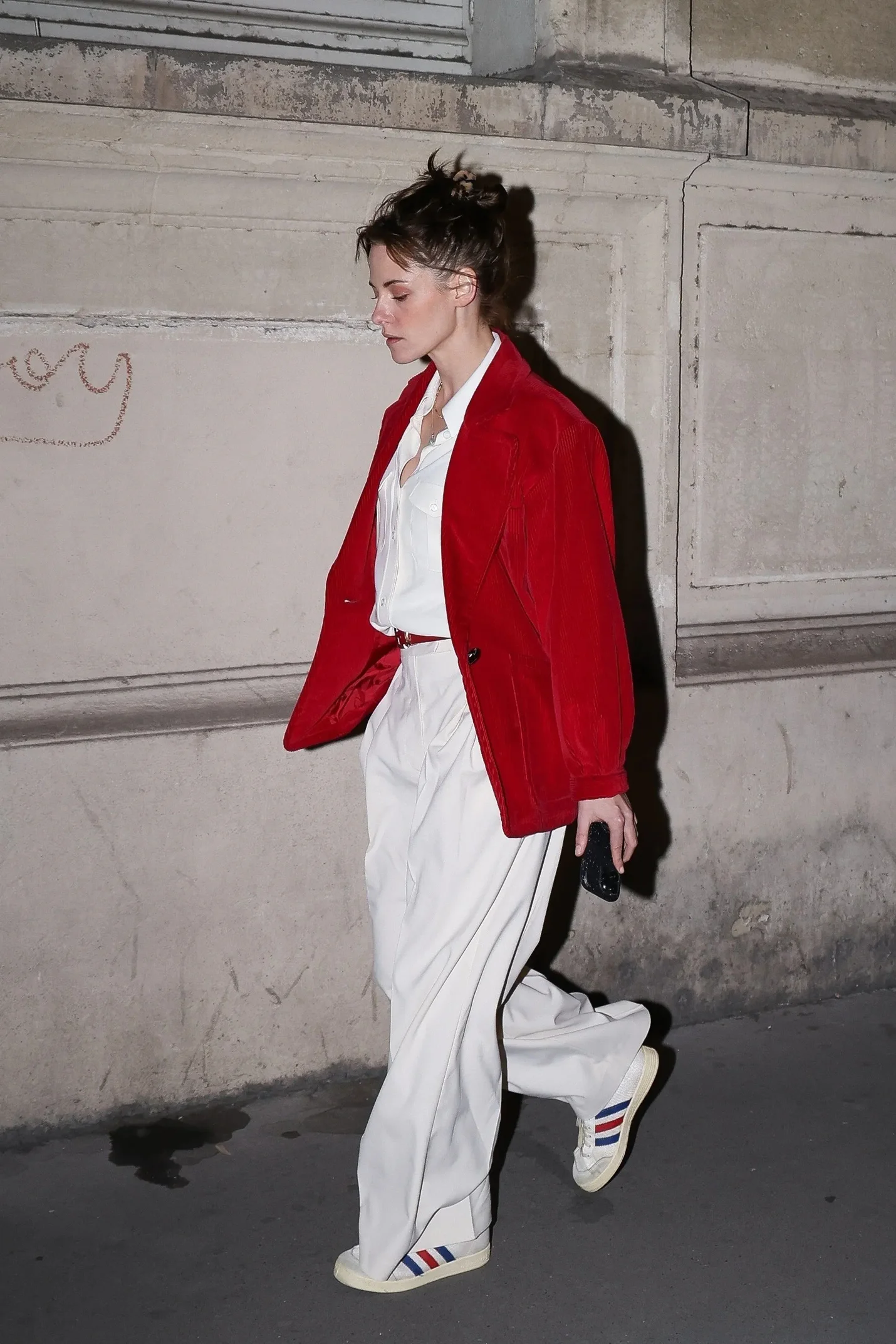 Kristen Stewart OOTD. Vibrant Red Jacket and White Ensemble with Sporty Accents