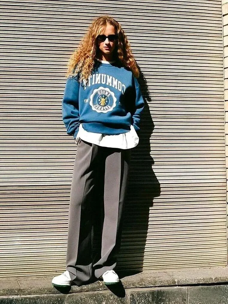 The oversized blue sweatshirt is a standout piece. Its graphic design adds a playful element, while the vibrant color keeps the look lively. The layering of a white shirt underneath introduces an interesting dimension and contrast, breaking the monotony and adding more depth to the ensemble. This choice complements the relaxed fit of the top, creating a well-balanced silhouette.
