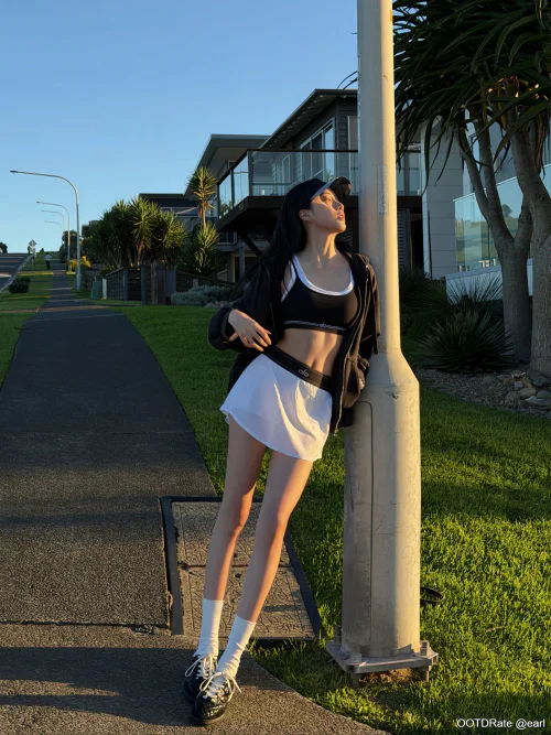 This outfit has a sporty, casual vibe that effectively combines athleisure with a trendy edge. The black sports bra paired with a white tennis skirt creates a striking contrast, adding visual interest through the use of monochrome tones. The black jacket draped over the shoulders adds depth and a relaxed feel to the ensemble, perfect for layering and adjusting to different temperatures.