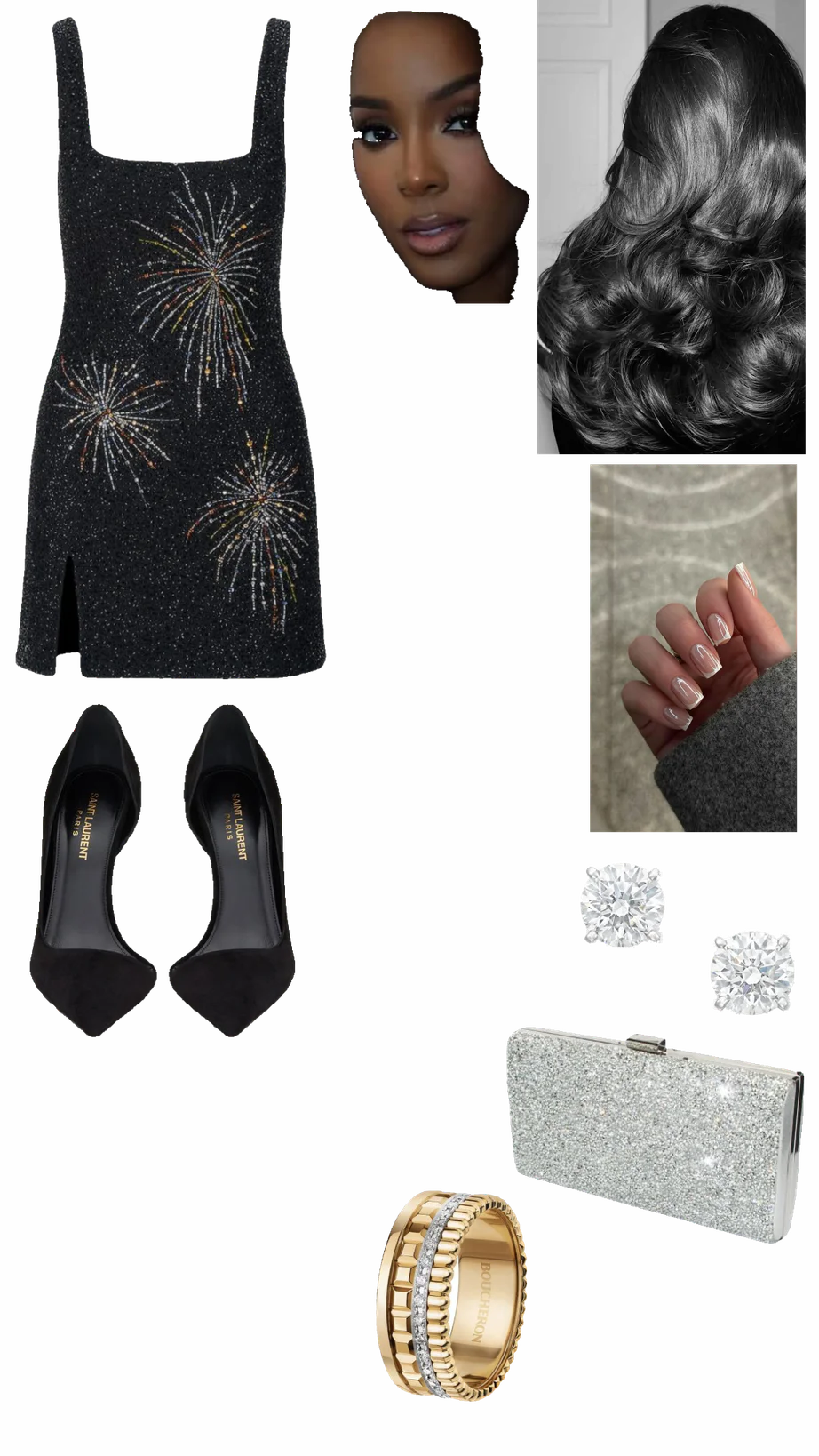 This outfit deserves an 8.5 out of 10 for its elegant and sophisticated flair. The black dress with intricate fireworks embellishments stands out with its festive and glamorous touch. This feature not only adds visual interest but also creates a striking focal point. The dress's fit appears well-tailored, with a subtle slit adding a bit of allure.