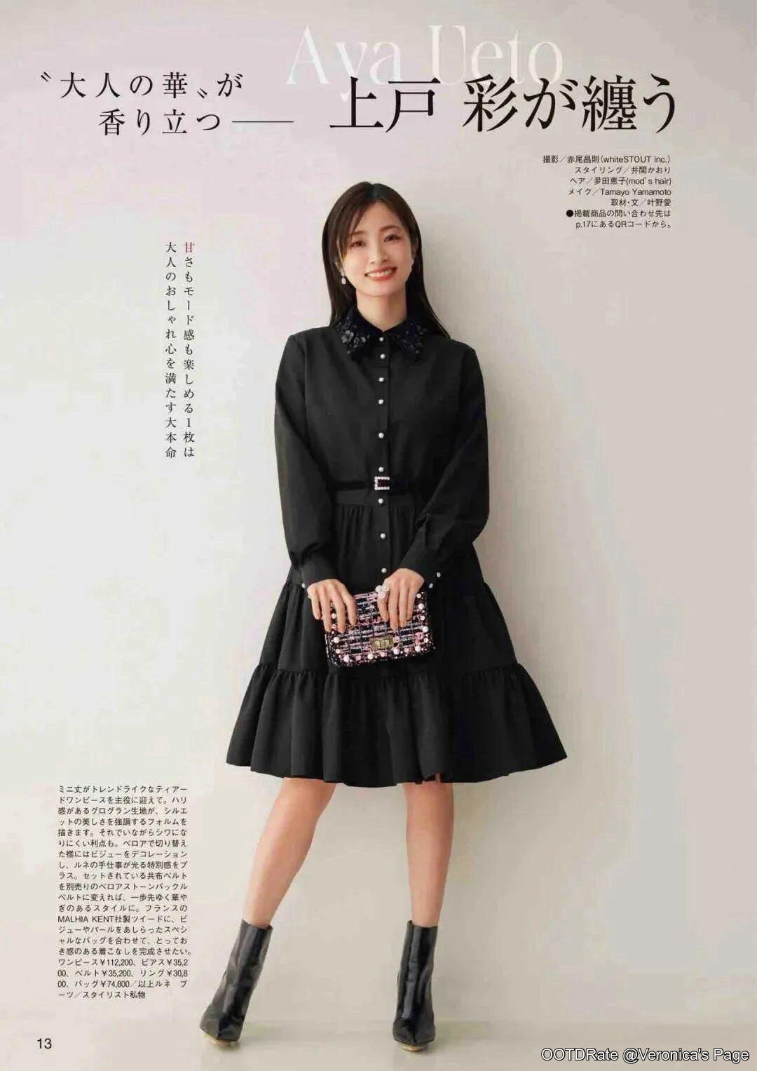 This outfit scores an 8.5. The black dress creates a sleek and sophisticated appearance that is both timeless and versatile. The dress features long sleeves and a knee-length hem, making it appropriate for multiple occasions, from a professional setting to an evening event. The addition of embellishments, likely on the collar, adds a touch of sparkle and uniqueness without overwhelming the overall minimalist aesthetic.