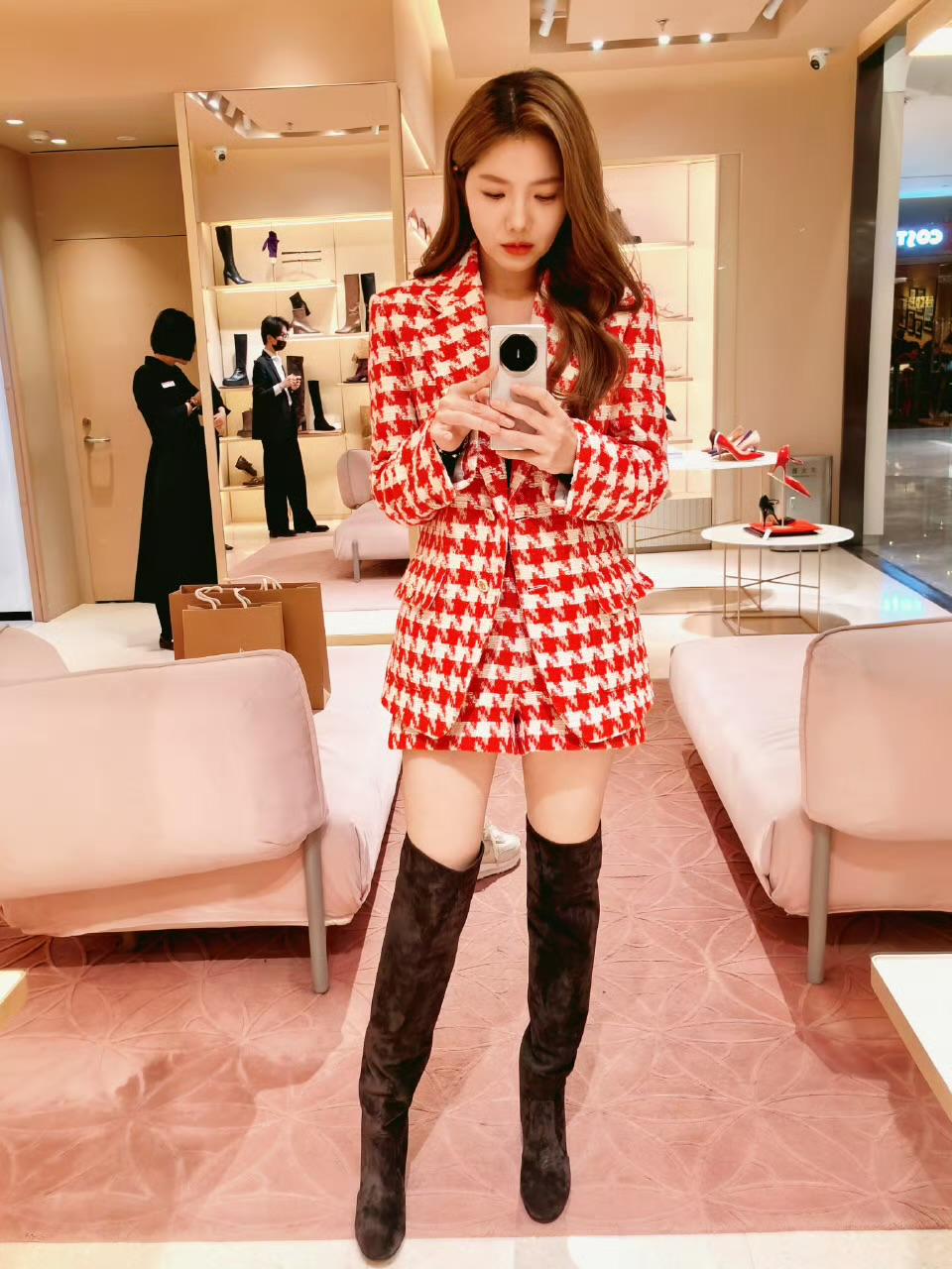 Bold Red Houndstooth Blazer Dress with Knee-High Black Boots