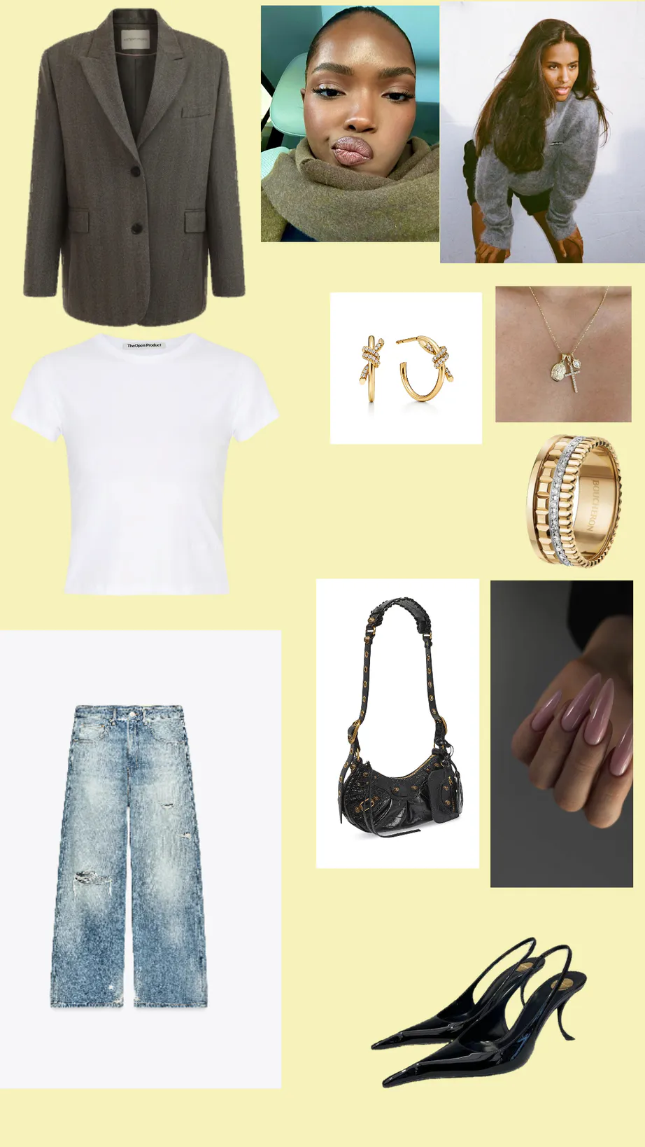 This outfit combines a casual aesthetic with sophisticated touches, scoring an 8.5 out of 10 for its versatile style and cohesive color palette. The oversized gray blazer is a standout piece, lending a structured and polished edge to the ensemble. Paired with the white tee, it maintains a laid-back vibe suitable for both casual and semi-formal settings. The distressed wide-leg jeans introduce a touch of edginess and contrast well against the blazer's formality.