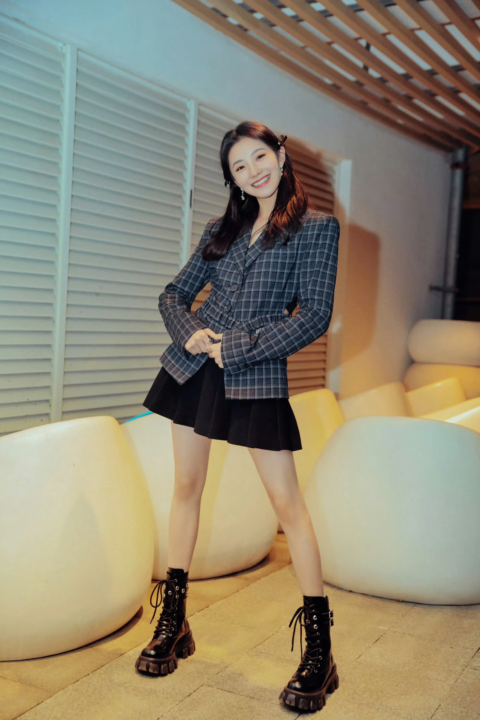 Color coordination is well-executed, with the neutral tones of the blazer harmonizing with the black elements of the skirt and boots. The grid pattern on the blazer is eye-catching and adds a layer of sophistication, keeping the ensemble from looking overly simplistic.