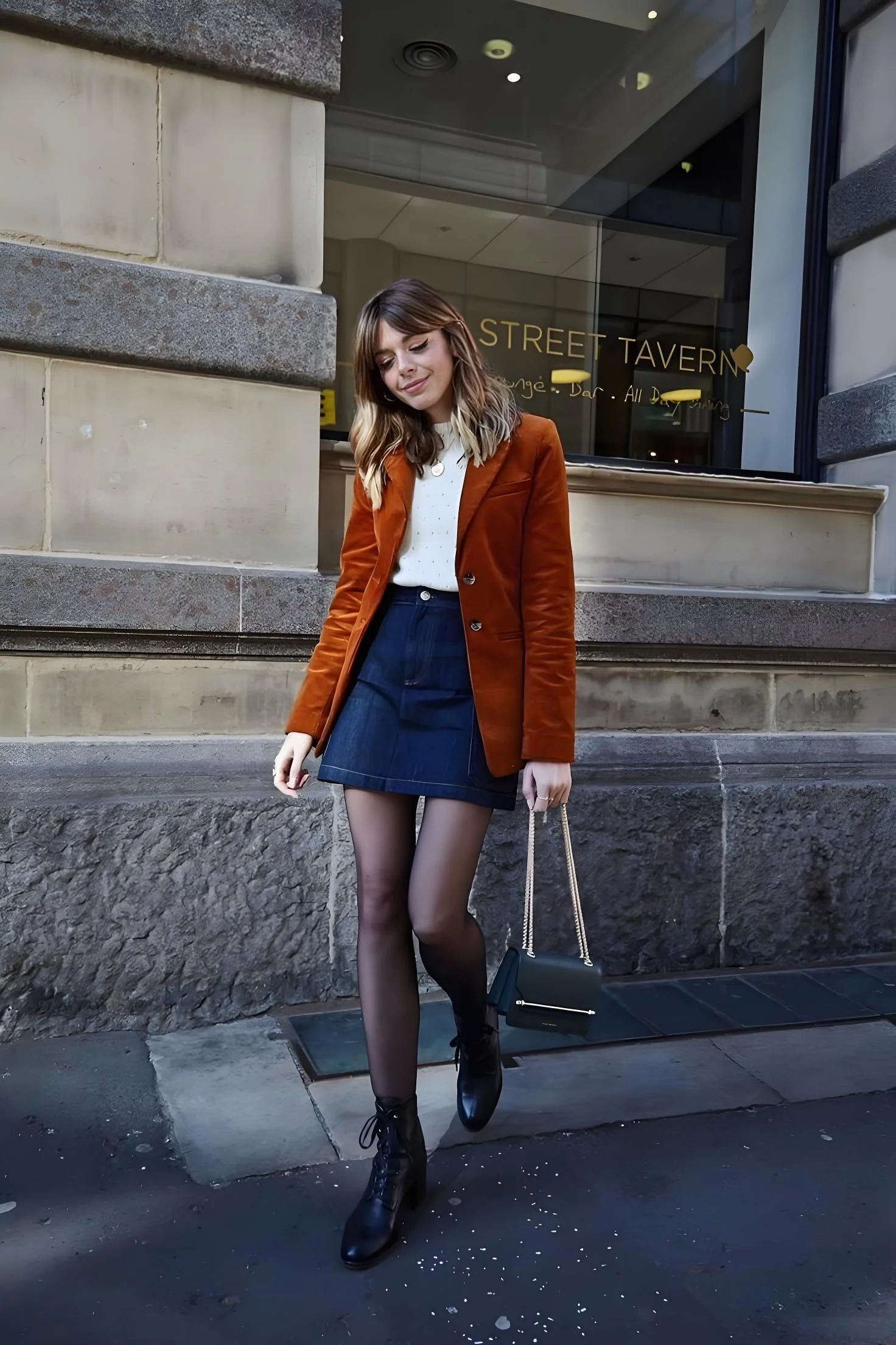 The choice of black lace-up ankle boots is both stylish and practical, giving the ensemble a slightly edgy, urban feel. They nicely complement the sheer tights, maintaining a cohesive color palette throughout the ensemble. The small, structured handbag adds a touch of elegance and ties the look together with its refined simplicity.