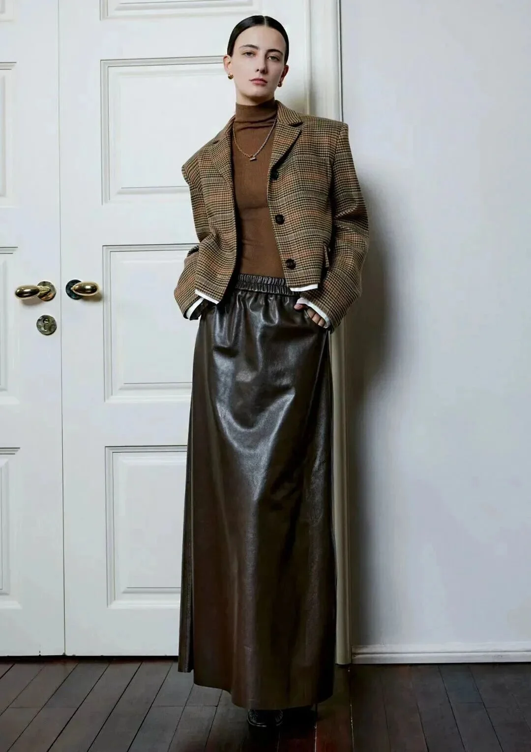 Sophisticated Earth Tones: Checkered Blazer and Leather Maxi Skirt Ensemble