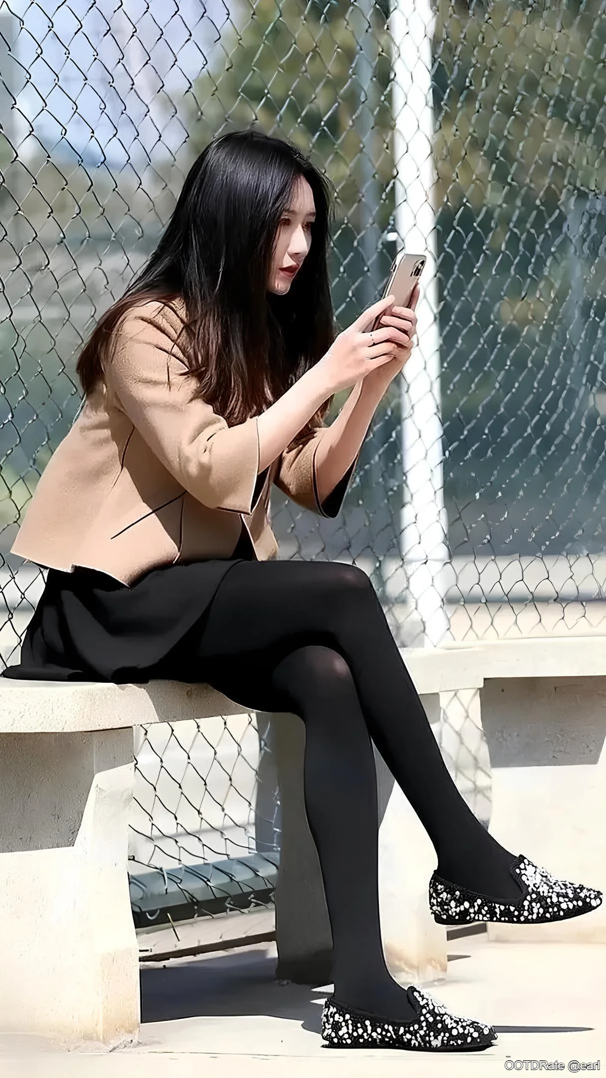 The black dress underneath is simple yet effective, offering a clean silhouette. The tights add a layer of warmth, which makes the outfit suitable for cooler weather while maintaining a sleek appearance. The standout piece here is the pair of loafers, embellished with a unique pattern that adds a playful, modern touch to an otherwise conventional outfit. This choice of footwear injects personality and flair into the look, steering it away from being too formal.