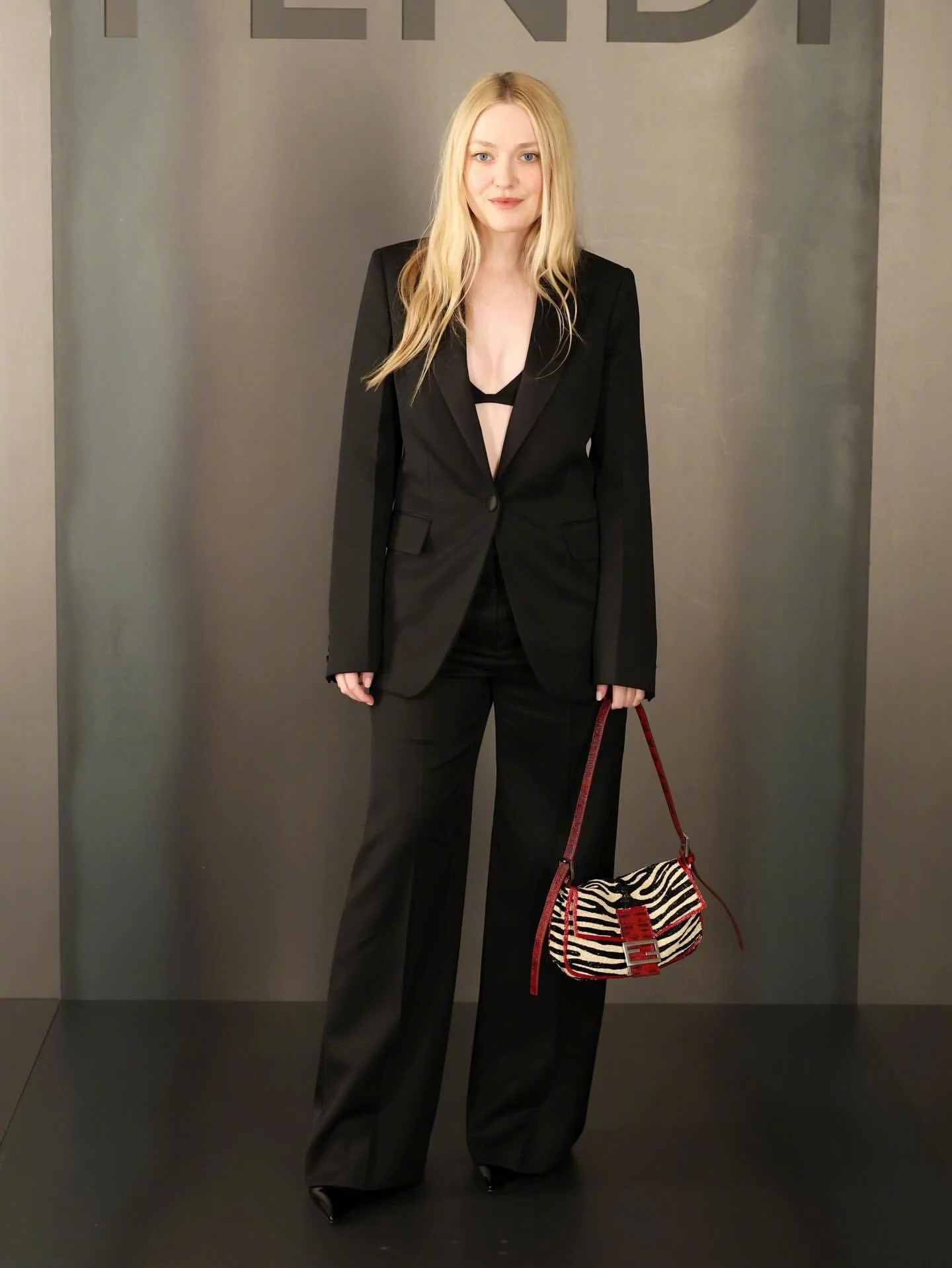 The color palette is timeless, with black creating a seamless foundation that's both versatile and striking. The addition of the zebra-patterned bag introduces a sense of playfulness and texture, breaking the monochrome with a pop of visual interest. The red details on the bag provide the perfect splash of color, subtly energizing the outfit.