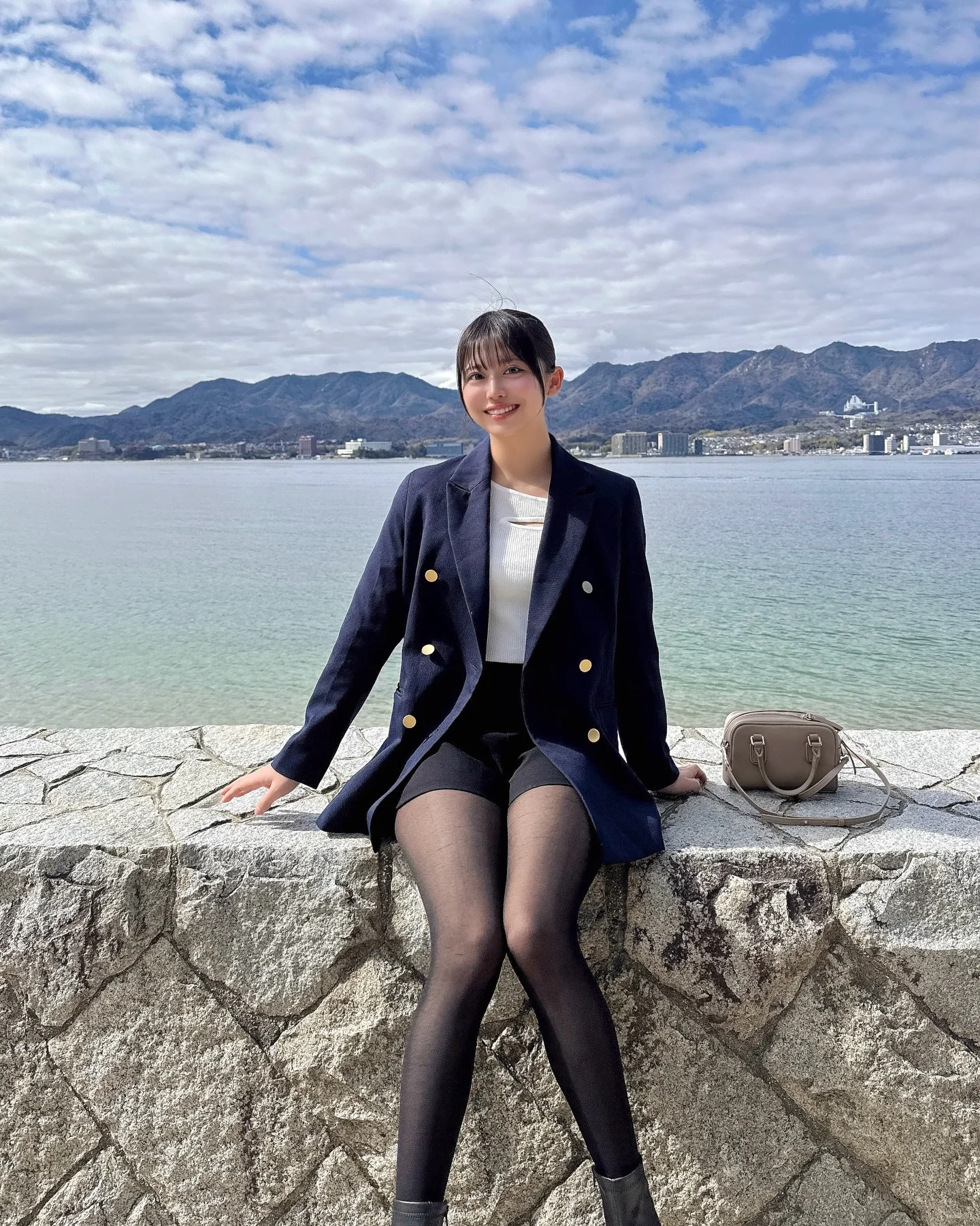 Color coordination between the navy, white, and black is well-executed, bringing a rich yet understated palette that suits both daytime and evening outings. For improvement, consider layering with a scarf or a statement necklace to inject more personality and depth into the ensemble.
