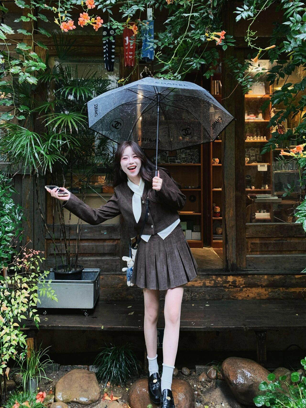 This outfit combines classic schoolgirl charm with modern details, scoring an 8.5 for its cohesive style and attention to detail. The brown blazer and pleated skirt present a timeless, collegiate look that is both sophisticated and playful. The structured fit of the blazer adds formality, while the pleated skirt provides a touch of youthful energy.