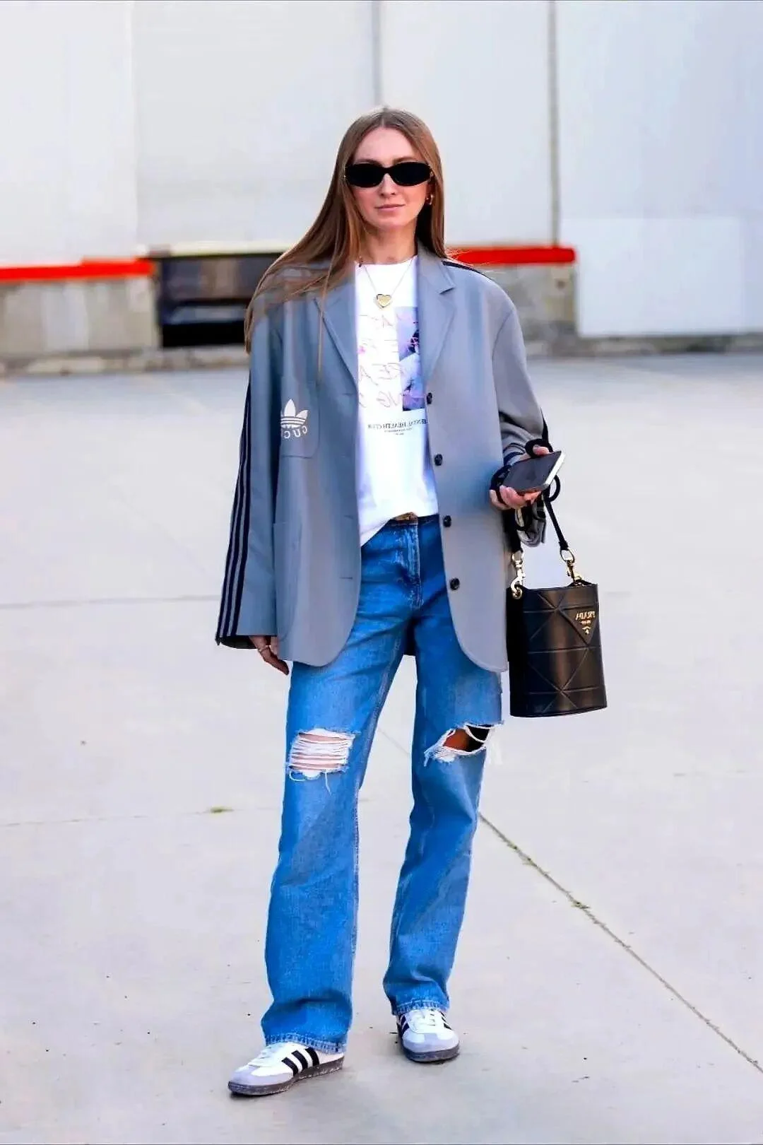 The white graphic T-shirt layered underneath the blazer keeps the look fresh and casual. The choice of Adidas sneakers complements the sporty theme, ensuring the outfit maintains consistency in style. Accessories such as the black structured bag add a touch of sophistication, balancing the casual elements with a bit of polish. The use of sunglasses enhances the urban appeal of the ensemble.