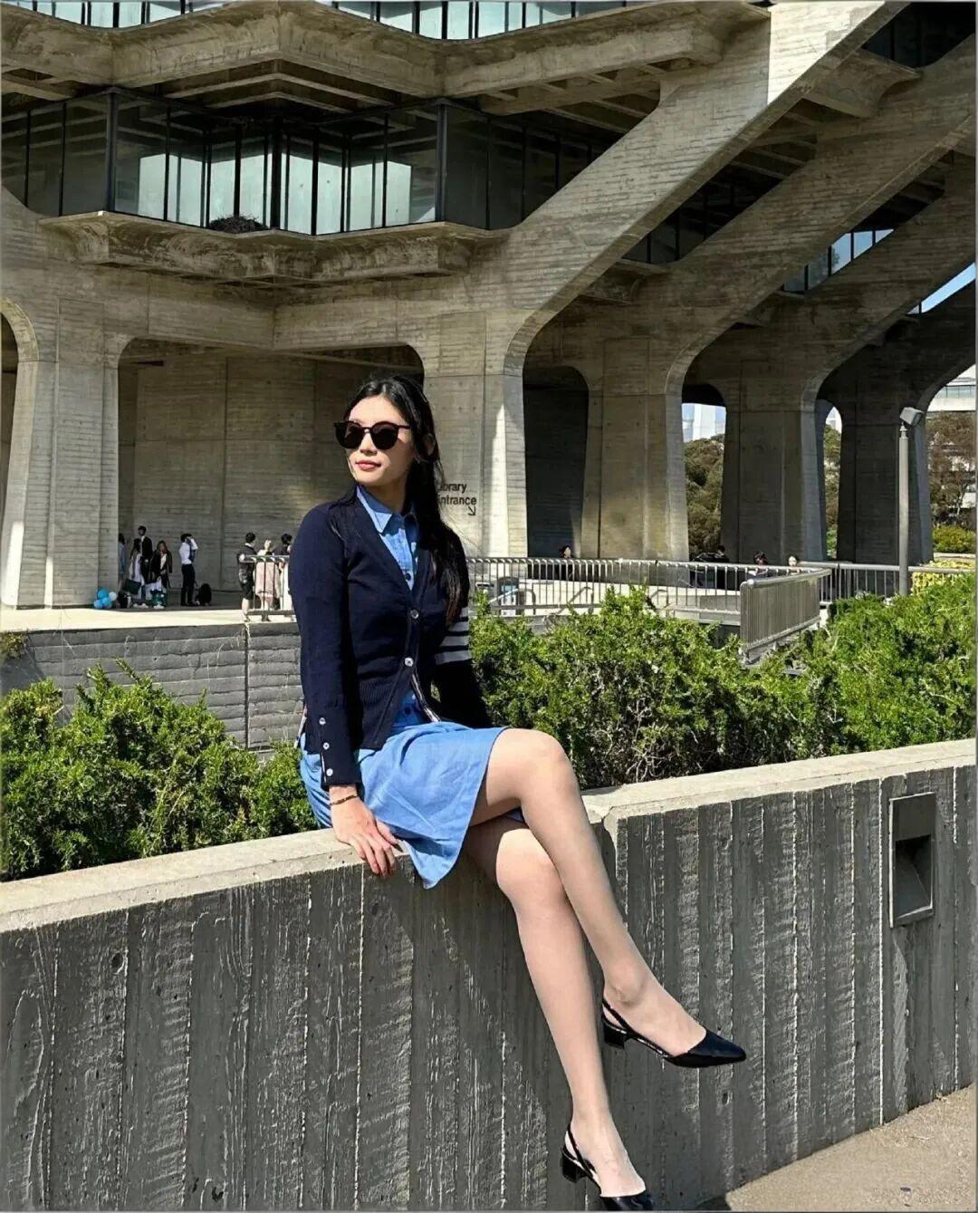 This outfit scores a solid 8.5 out of 10. The ensemble combines a tailored navy blazer with a light blue dress, creating a sophisticated and classic contrast that is visually appealing. The blazer adds a formal touch, perfect for professional or semi-formal occasions, while the dress underneath introduces a lighter, more casual vibe that keeps the look balanced and fresh.