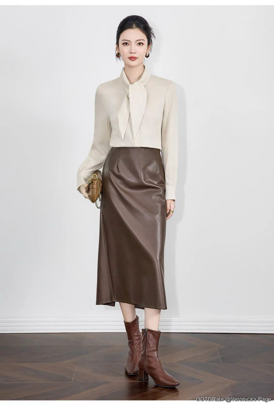 I'd rate this outfit an 8.5. The ensemble is elegant and well-coordinated, perfect for a sophisticated, professional setting or an upscale casual event. The cream blouse with a bow tie adds a touch of femininity and softness to the look. Its fit is structured yet relaxed, pairing well with the high-waisted brown leather skirt, which brings a modern, edgy contrast through its glossy texture.
