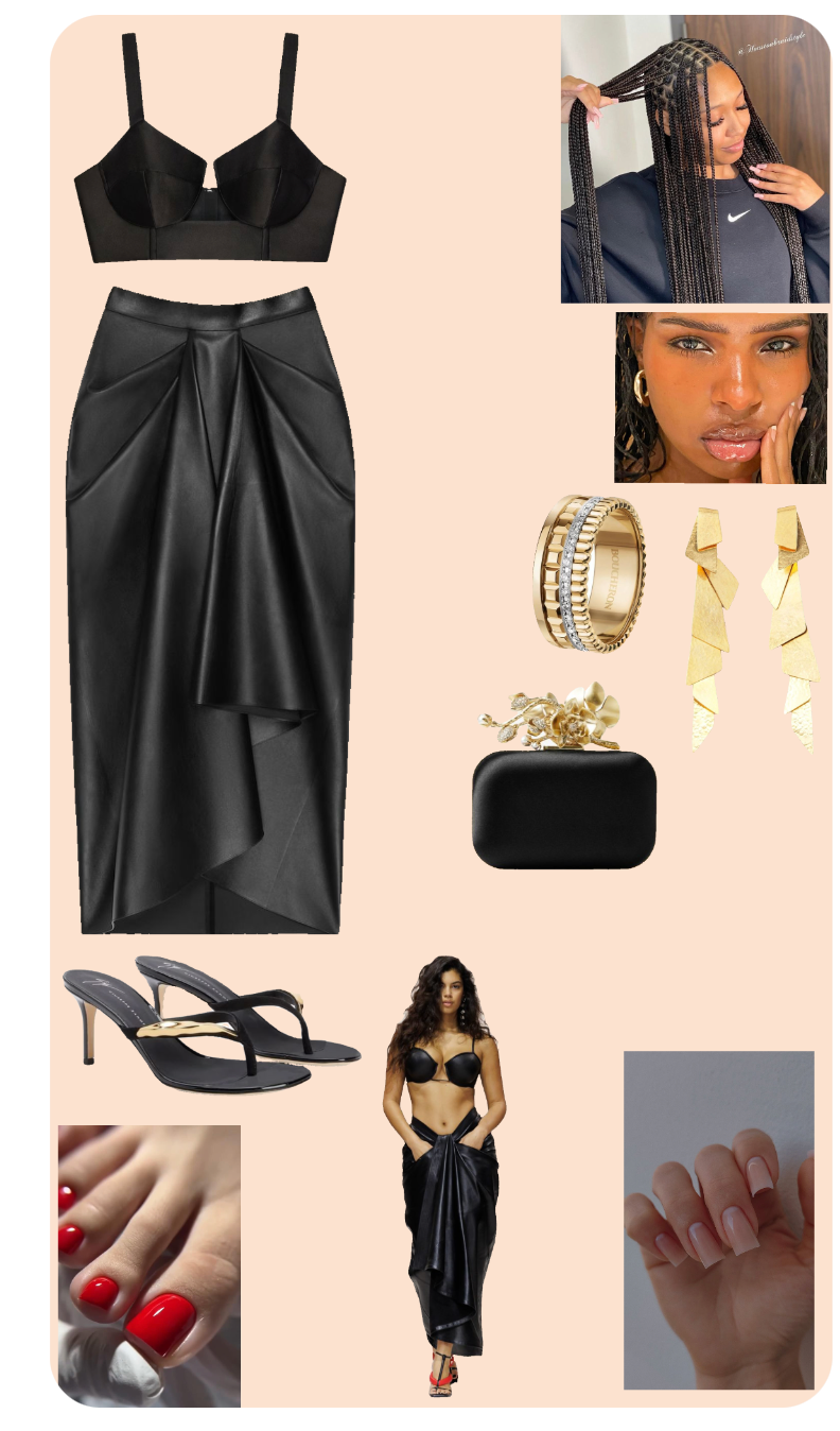 This outfit scores an 8.5. The overall look is sleek and sophisticated, focusing on a minimalistic yet bold aesthetic. The black bralette paired with the high-waisted, asymmetrical leather skirt creates a striking silhouette that is both modern and edgy. The choice of black enhances the outfit's versatility and timelessness, perfect for a chic evening event.