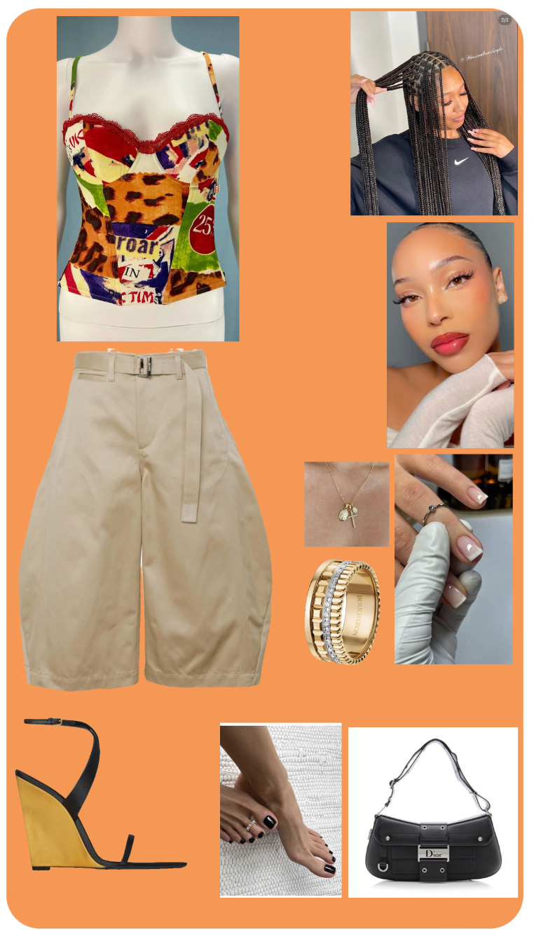 This outfit scores an 8.5 out of 10. The standout piece is the vibrant bustier top, which features a bold collage of patterns and colors, instantly making it a focal point. The top is paired with high-waisted beige bermuda shorts, providing a neutral base that balances the outfit while maintaining a chic, tailored silhouette. This combination creates a modern and trendy aesthetic.