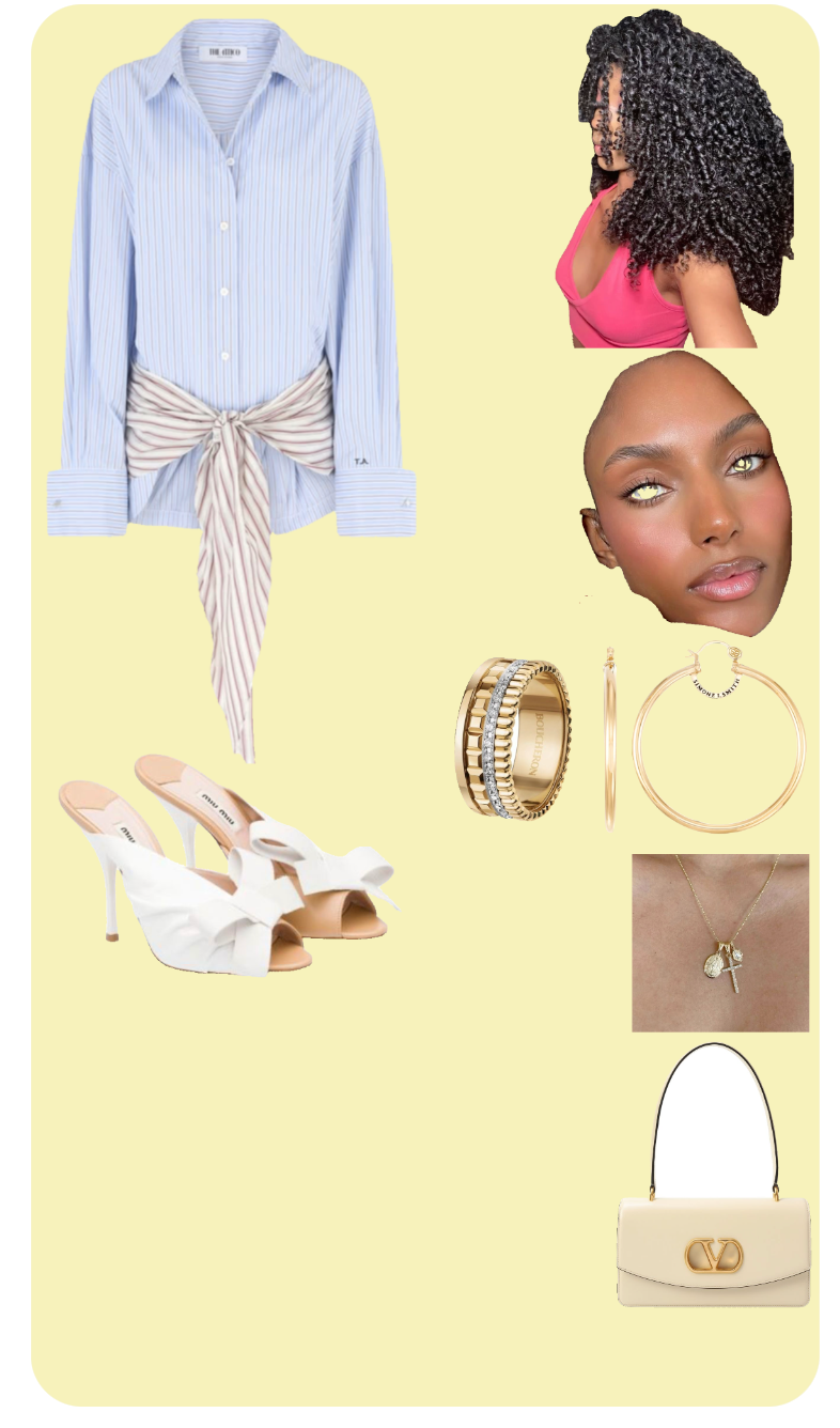 This outfit skillfully blends casual elegance with trendy accessories, earning it a solid 8.5 out of 10. The focal piece, a light blue striped button-down shirt with an interesting tied waist, creates a flattering silhouette and adds a touch of sophistication. Pairing it with these white open-toe heels enhances the look with a modern, minimalist feel. The shoes complement the shirt’s light tones, ensuring a cohesive aesthetic.