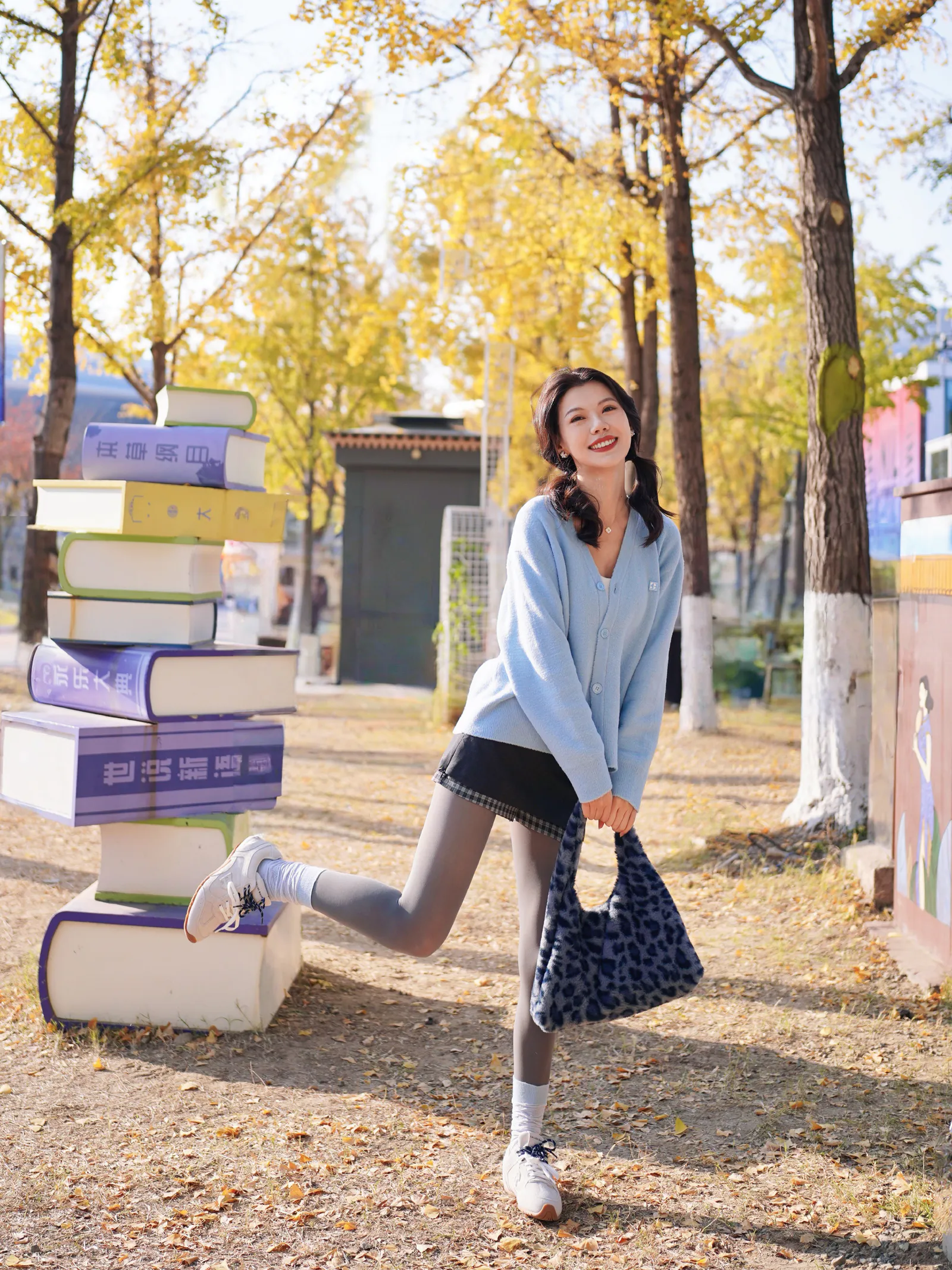 This outfit combines a playful and contemporary style, showcasing an appealing mix of colors and textures. The light blue cardigan is a standout piece, offering a soft, cozy feel and a fresh color that complements the autumn setting. It pairs well with the black skirt, which adds contrast and balances the pastel tone of the cardigan. The skirt's short length is trendy and suits the casual vibe of the overall look.