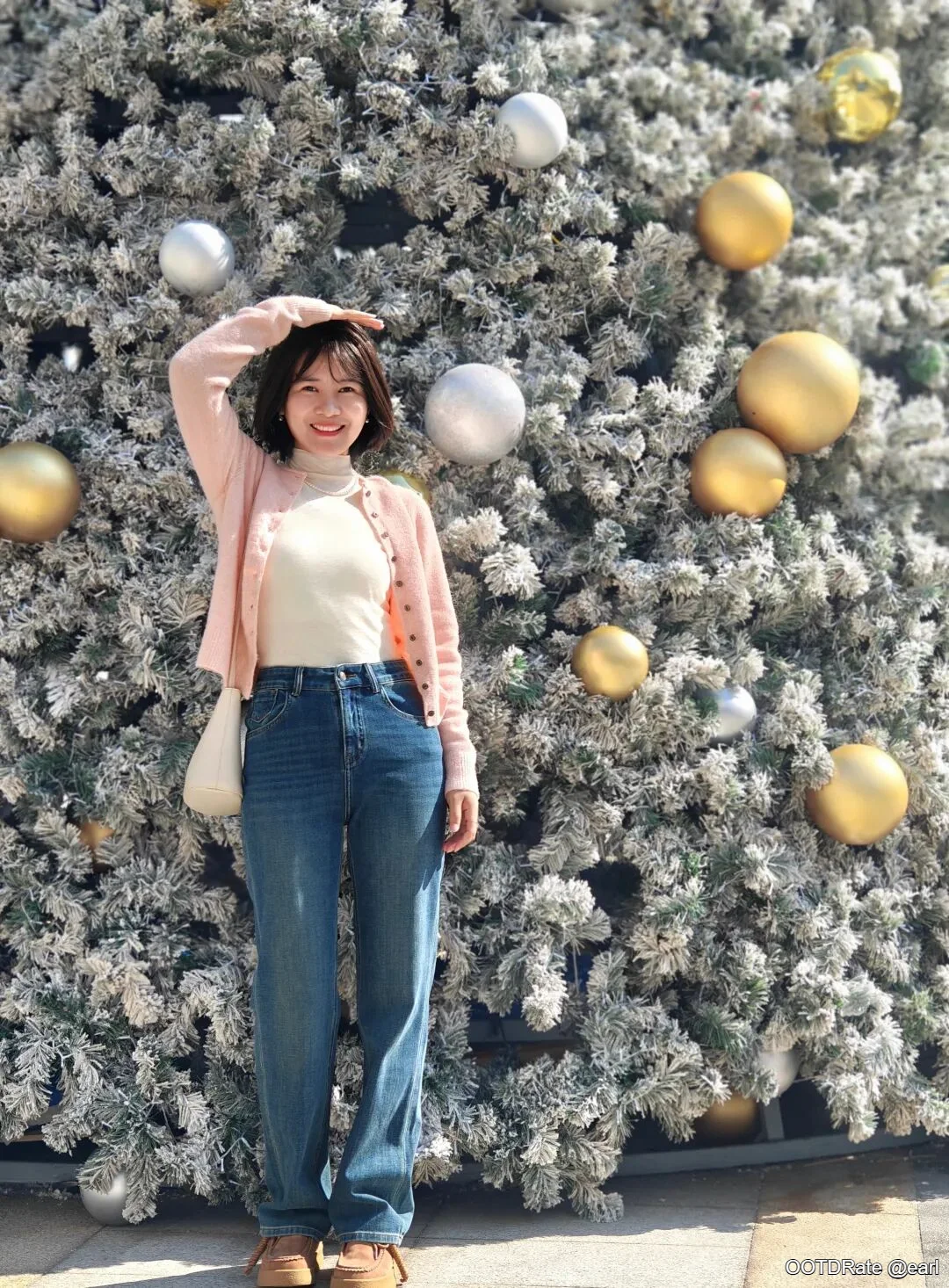 Christmas Outfit: Pink Cardigan and Blue Jeans for a Casual Chic Look
