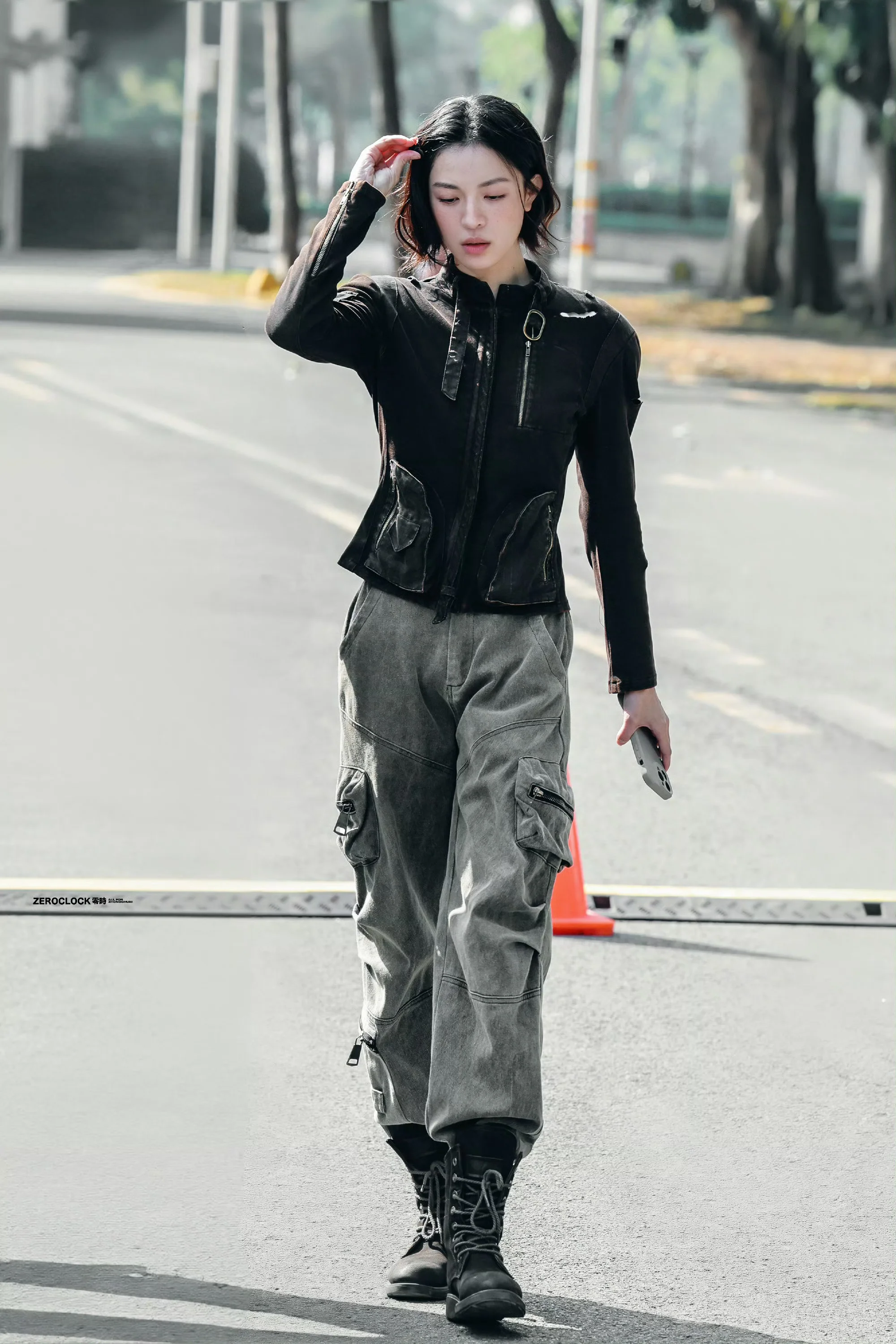 The cargo pants introduce a relaxed element with their loose fit and practical pockets. The grey tone of the pants complements the black jacket, creating a monochrome palette that's visually appealing and versatile. The boots are a crucial component, heightening the utilitarian vibe and adding a touch of toughness that harmonizes with the cargo pants.