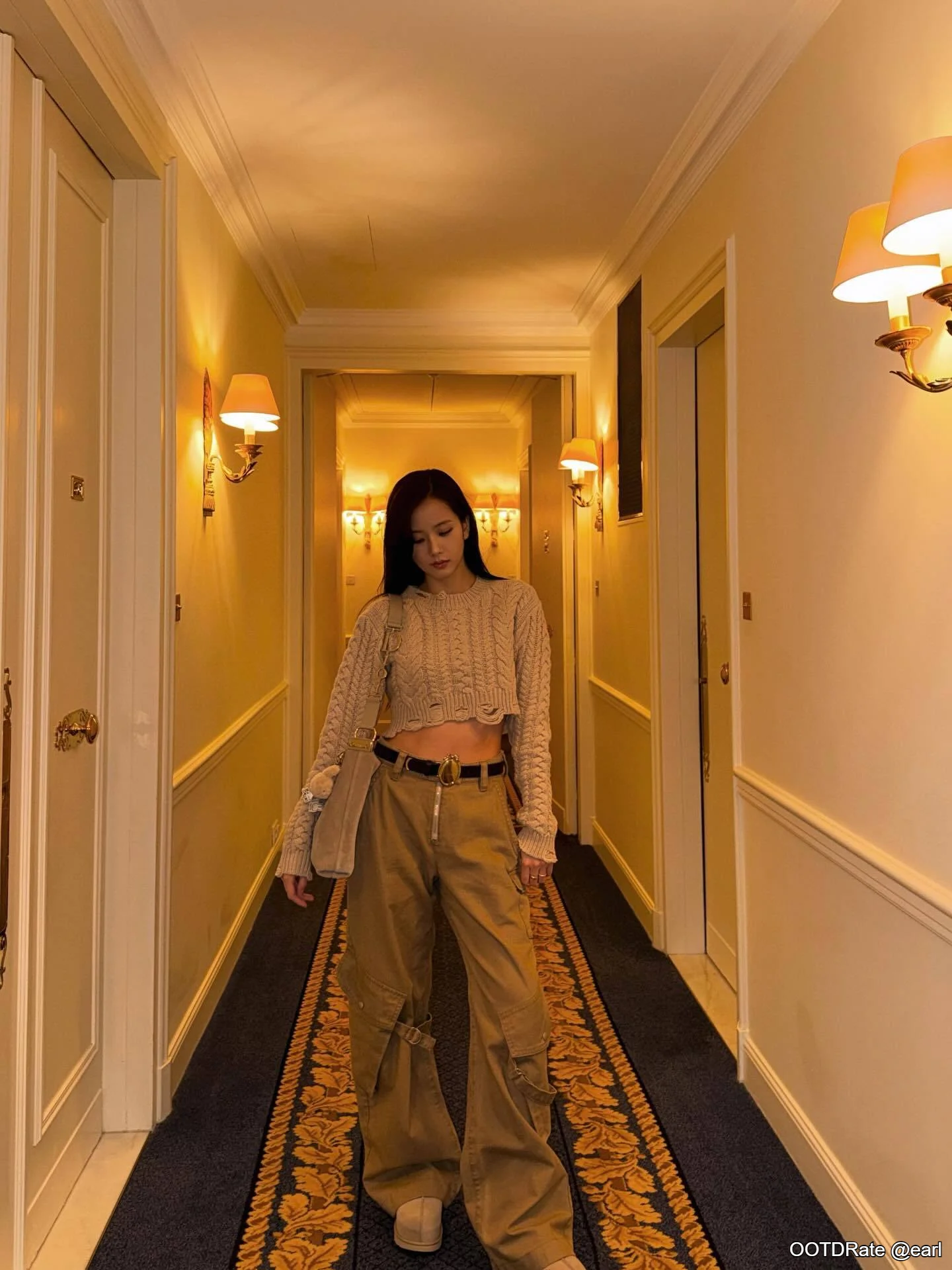 This outfit receives a solid 8.5. The combination of a cropped, textured sweater with wide-leg cargo pants creates a balanced blend of comfort and style. The sweater, with its neutral beige tone, offers a cozy, laid-back appeal that pairs well with the more rugged, utilitarian feel of the cargo pants. The earth tones are harmonious, creating a cohesive look that is both fashionable and approachable.