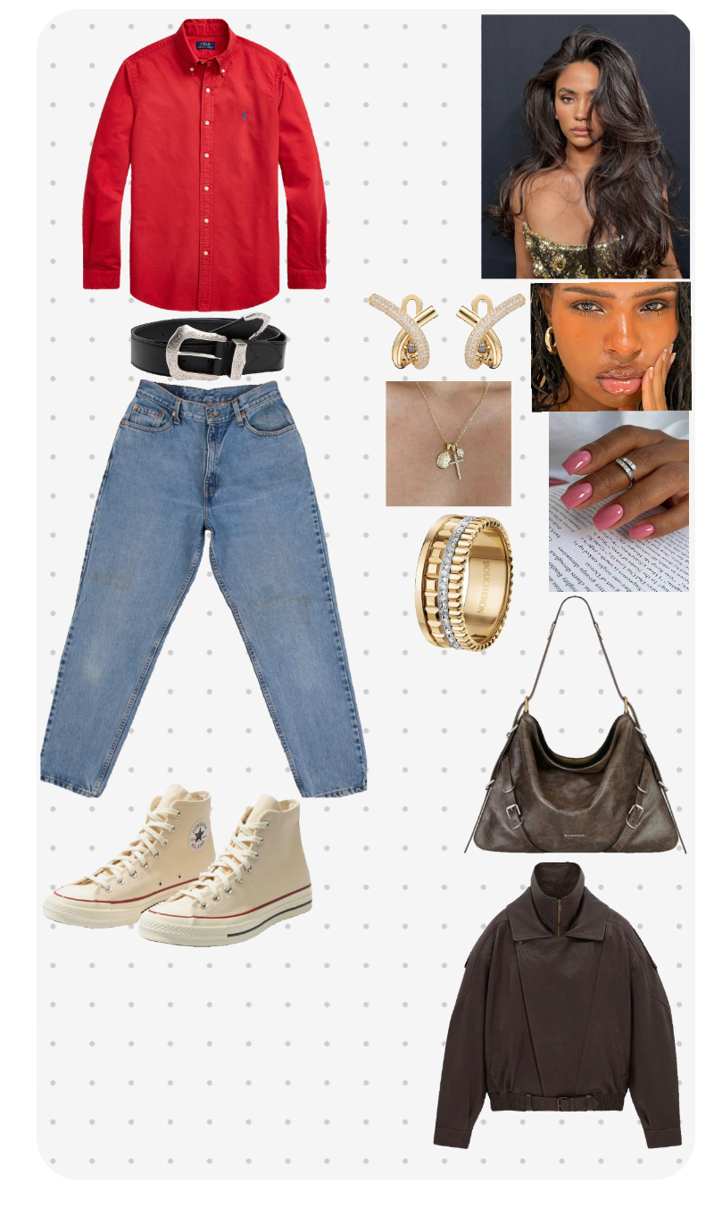 This outfit is a mix of casual and edgy elements, suitable for a stylish and relaxed day out. The bright red button-up shirt adds a bold and vibrant touch to the ensemble. Paired with the light wash, slightly oversized jeans, it creates a balanced casual look. The jeans offer a laid-back vibe, which is a nice contrast to the more structured top.
