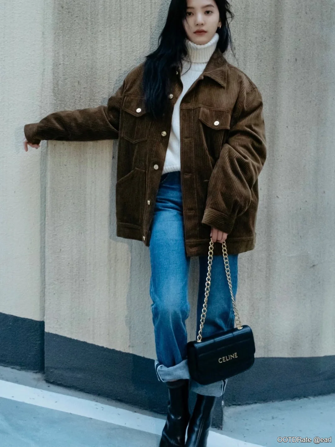 This outfit scores an 8.5. The ensemble creates a cozy yet stylish look, perfect for casual outings during cooler seasons. The oversized brown corduroy jacket is the highlight, offering both texture and warmth. Paired with a classic white turtleneck, it adds a layer of simplicity underneath, which balances the heavier jacket. The light blue jeans work well with the brown and white, offering a relaxed yet polished vibe.