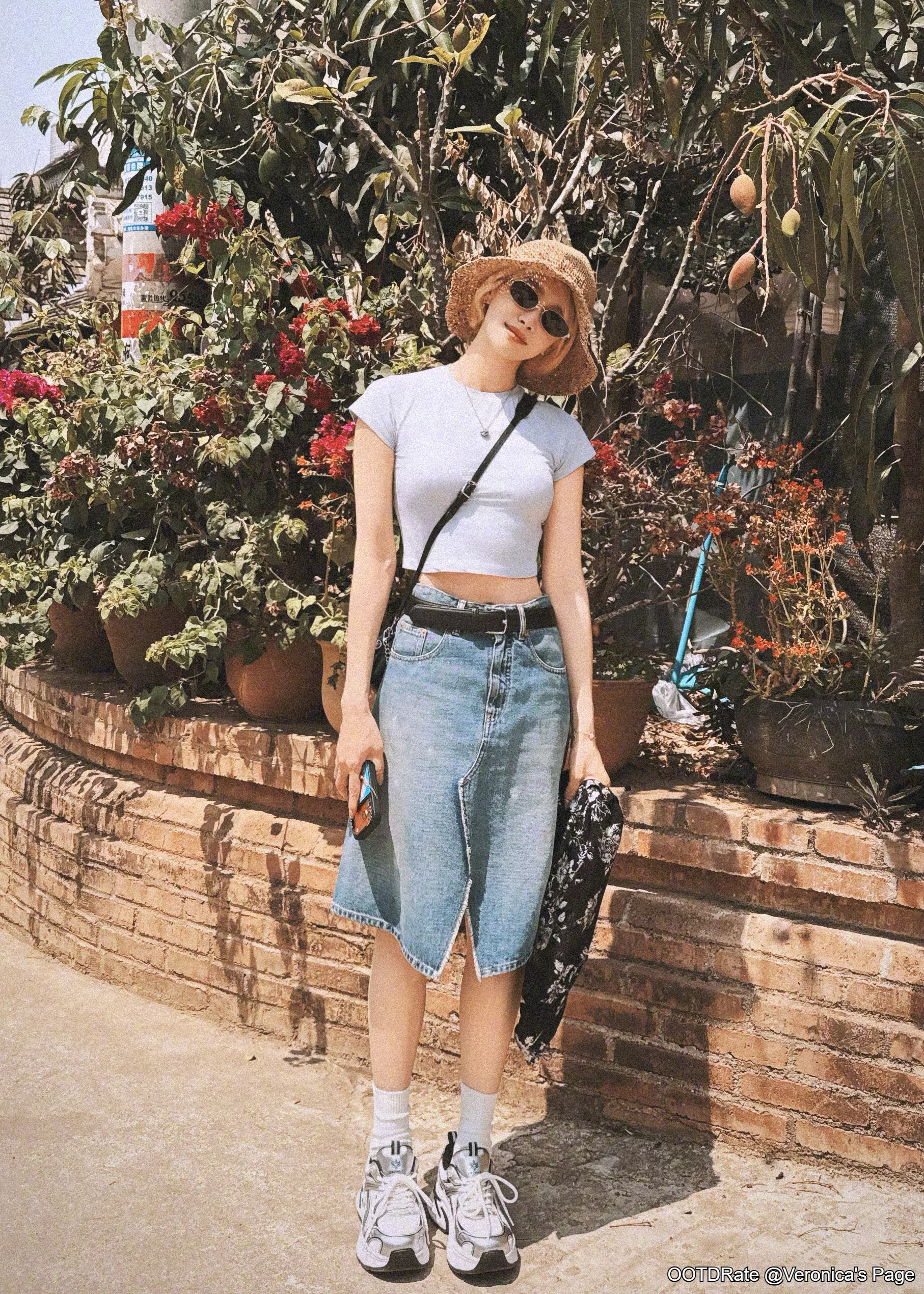 This outfit scores an 8.5 for its stylish approach to casual summer wear. The white cropped top is a versatile piece, providing a clean, fresh base that highlights the waist. Pairing it with a high-waisted denim skirt adds a classic touch, embodying a relaxed yet chic silhouette. The skirt's A-line shape offers a nice contrast to the fitted top, creating balance within the ensemble.