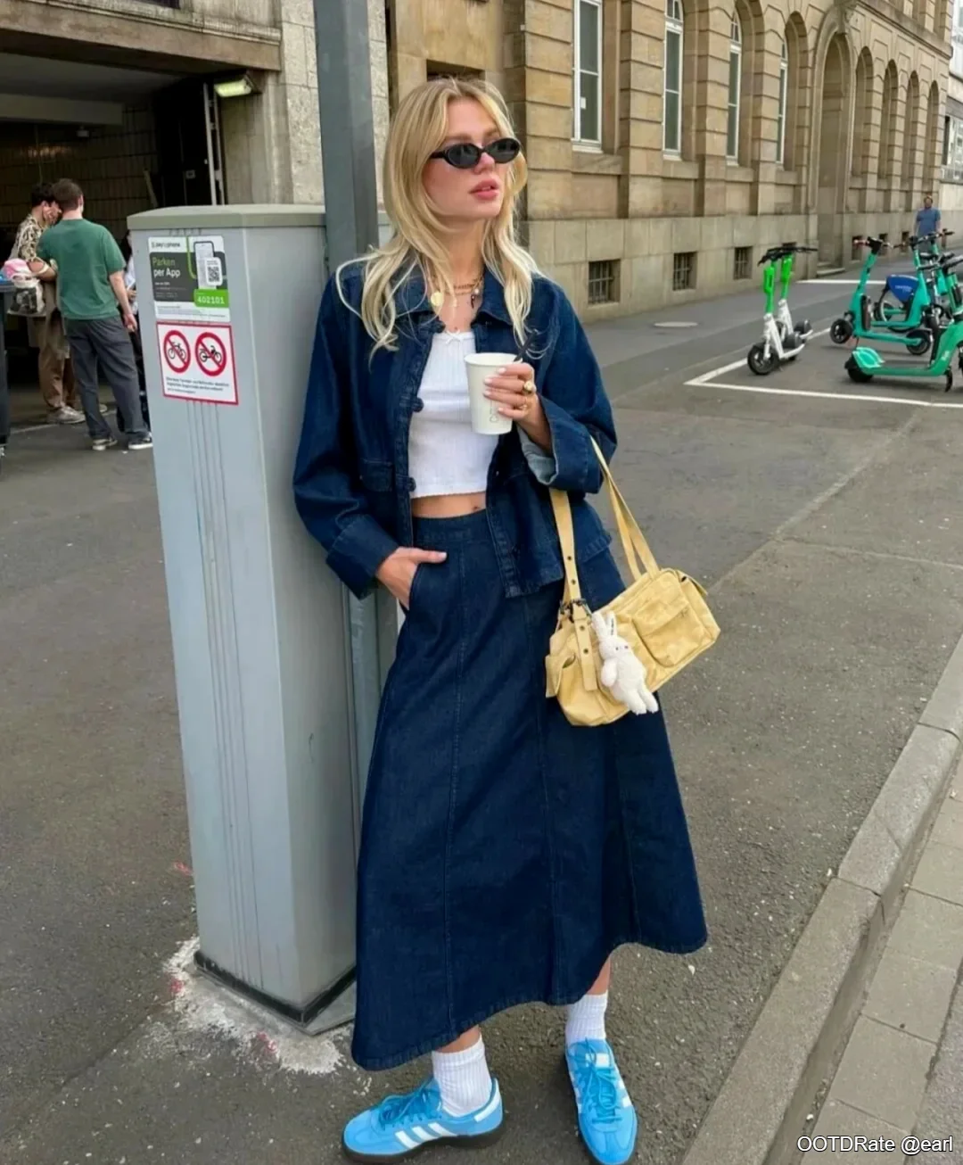 The light blue sneakers are a bold and playful choice, injecting a pop of color that enhances the outfit’s casual vibe. The white socks further accentuate this casual feel, providing a youthful and relaxed appearance. The yellow handbag adds another layer of color diversity, tying the ensemble together with a touch of whimsy and functionality.
