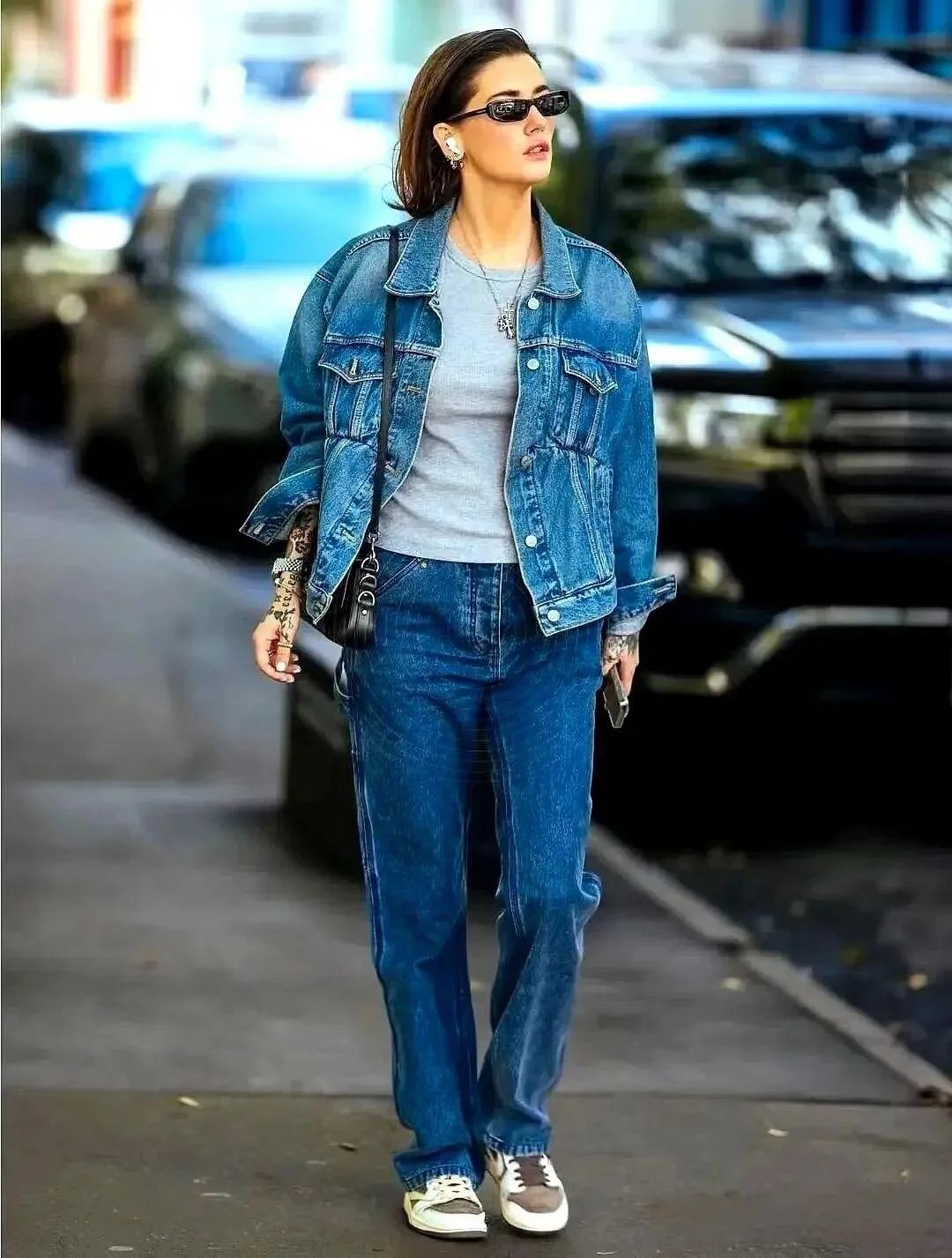 Overall, this outfit flawlessly captures a casual denim-on-denim style, demonstrating how simplicity and classic pieces can result in a fashionable street-style ensemble.