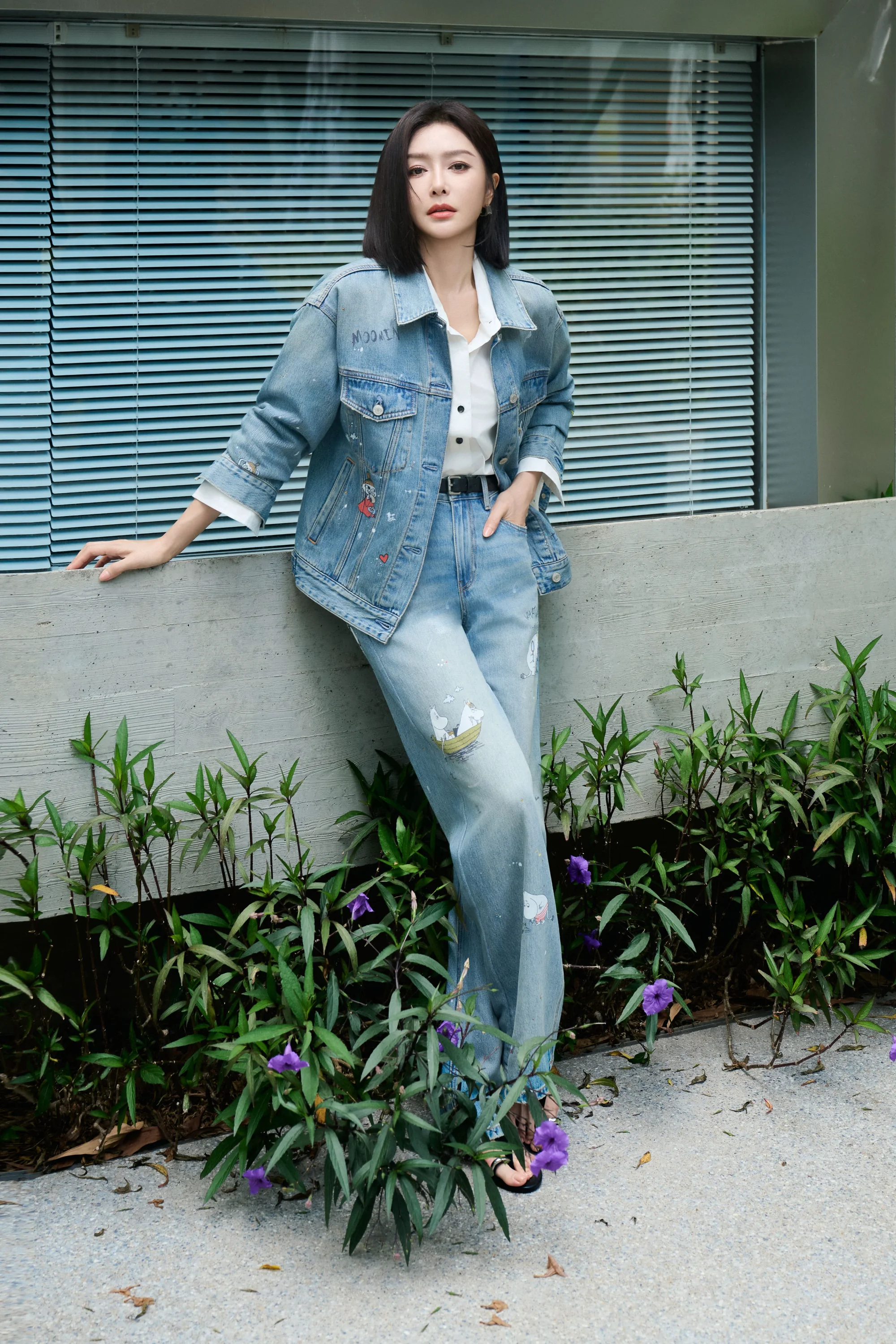 Footwear is understated, which works well in drawing focus to the denim and creating harmony within the ensemble. Accessories are minimal, keeping the attention primarily on the denim coordination.
