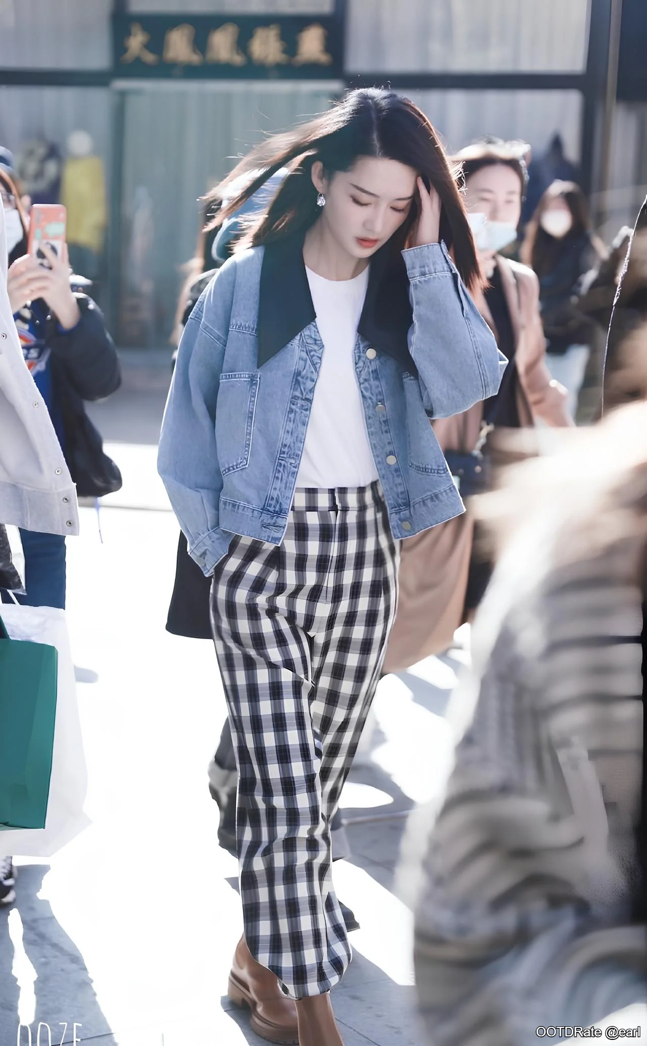 Casual Chic: Denim Jacket, White Top, and Checkered Pants Ensemble