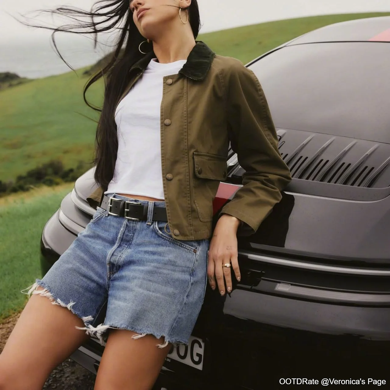 The jacket adds an element of structure and warmth, and its earthy tone complements the casual denim. The collar detail on the jacket enhances its overall design and adds sophistication to the casual ensemble. The length of the shorts is on trend, with a frayed hem that adds a hint of edginess and carefree style.