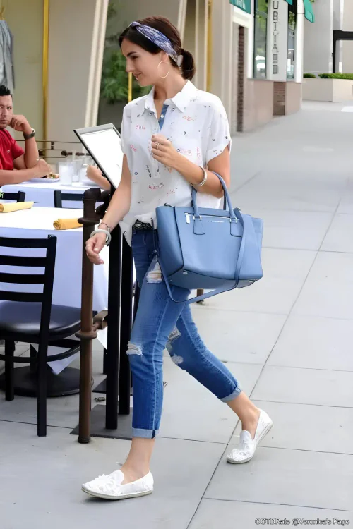 The choice of white slip-on shoes complements the shirt well, keeping the overall color palette cohesive and clean. The addition of a medium blue handbag introduces a pop of color while remaining versatile, effortlessly balancing and elevating the outfit.