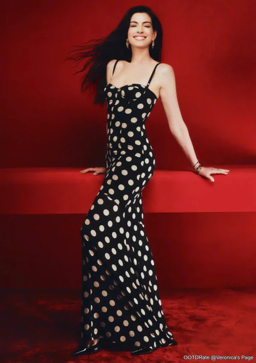 Anne Hathaway: Elegant Black Polka Dot Gown with Delicate Straps and Minimal Accessories