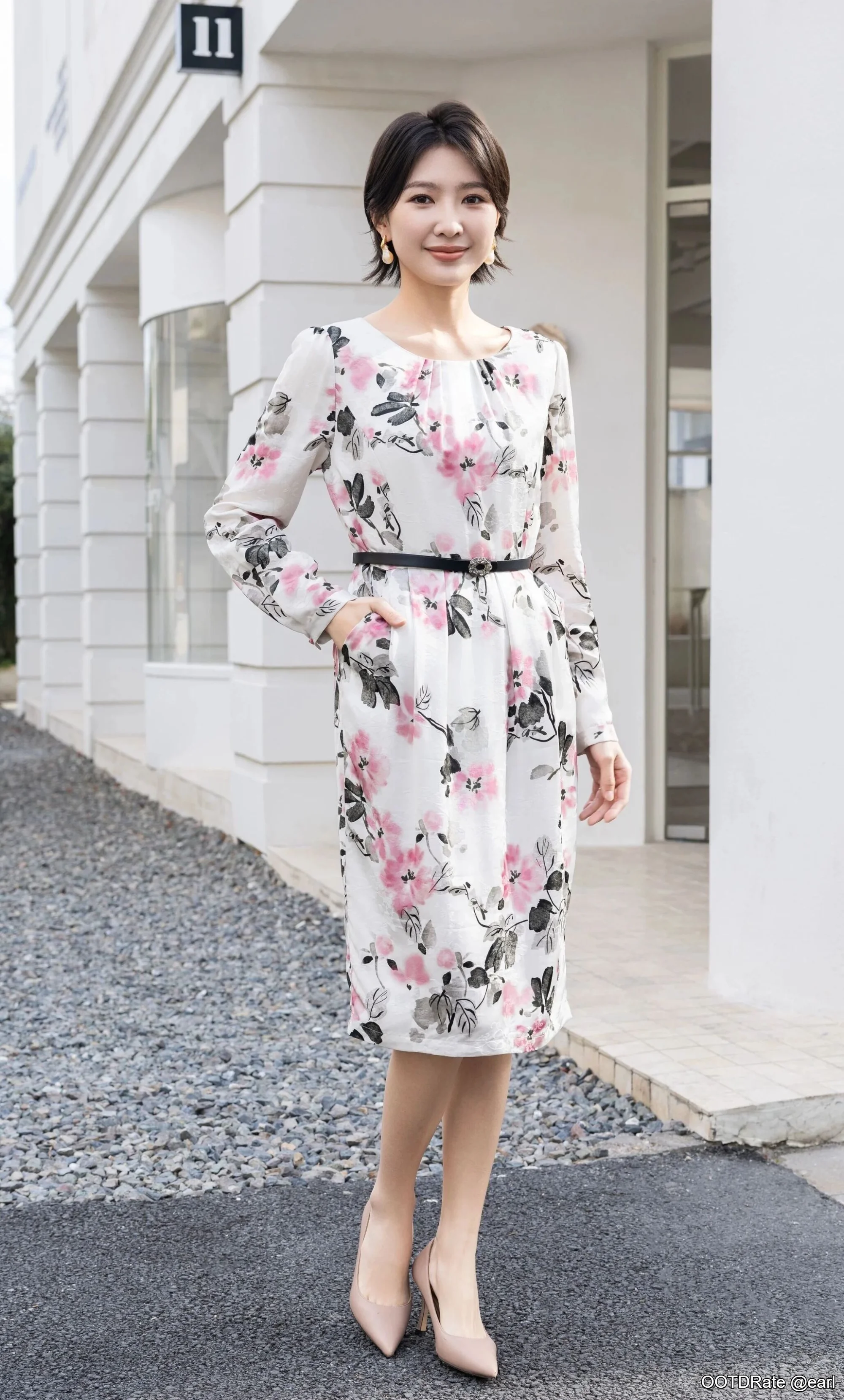 Elegant Floral Dress with Belt and Nude Pumps for Sophisticated Daytime Style