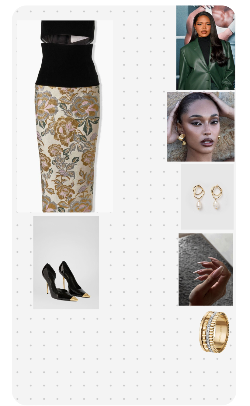 The black pointed-toe heels with gold accents further enhance the sophistication of the look. They are not only stylish but also elongate the leg line, adding height and grace. The choice of accessories, including the pearl drop earrings and gold ring, adds a touch of understated glamour without overwhelming the outfit. These accessories are wisely chosen to complement rather than compete with the bold print of the skirt.