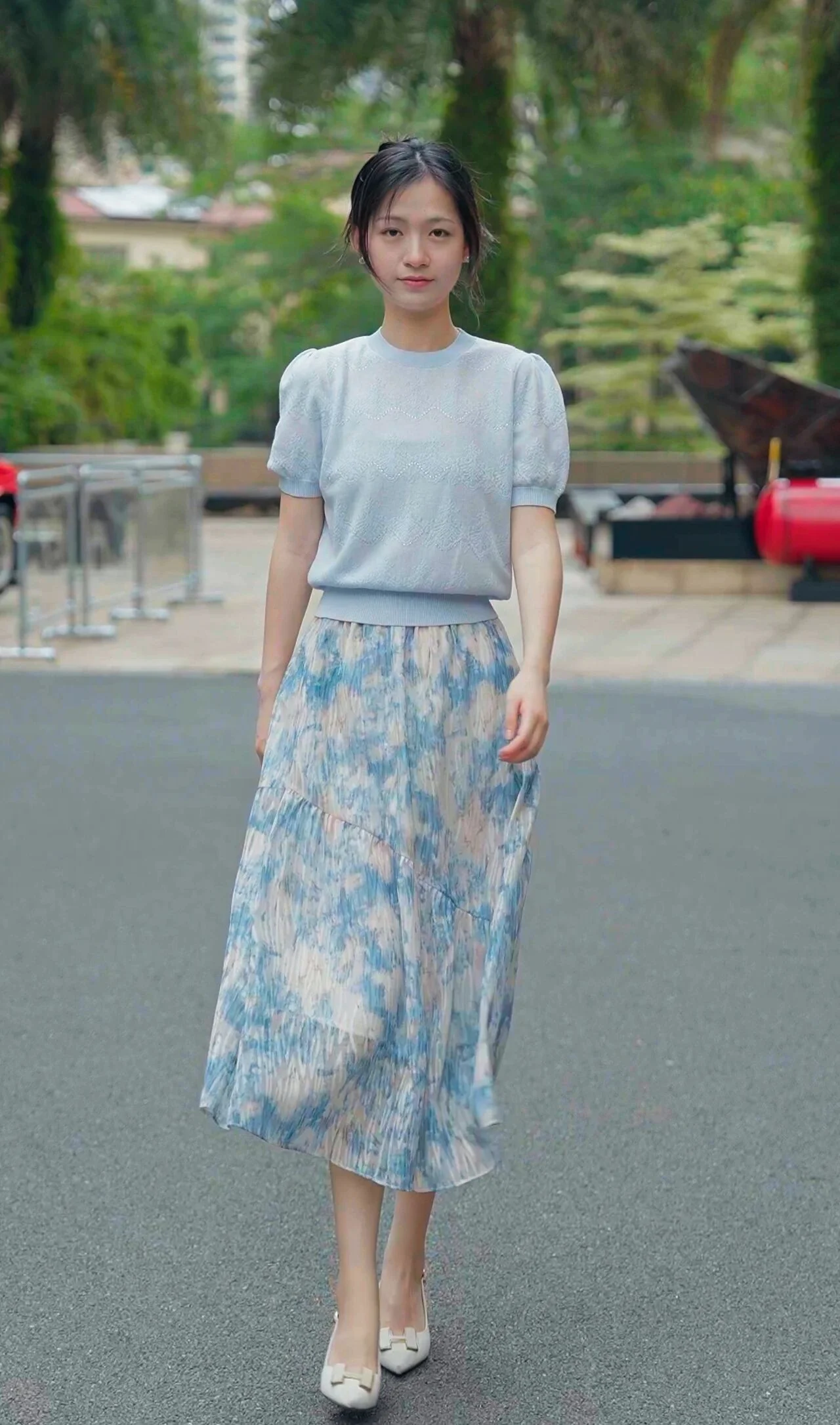 The skirt's length is modest, and its flowy nature gives it a romantic and graceful essence. The pleats add texture and movement, enhancing its aesthetic appeal. Pairing this ensemble with light-colored, elegant shoes is a wise choice, maintaining the outfit's overall light and airy feel.